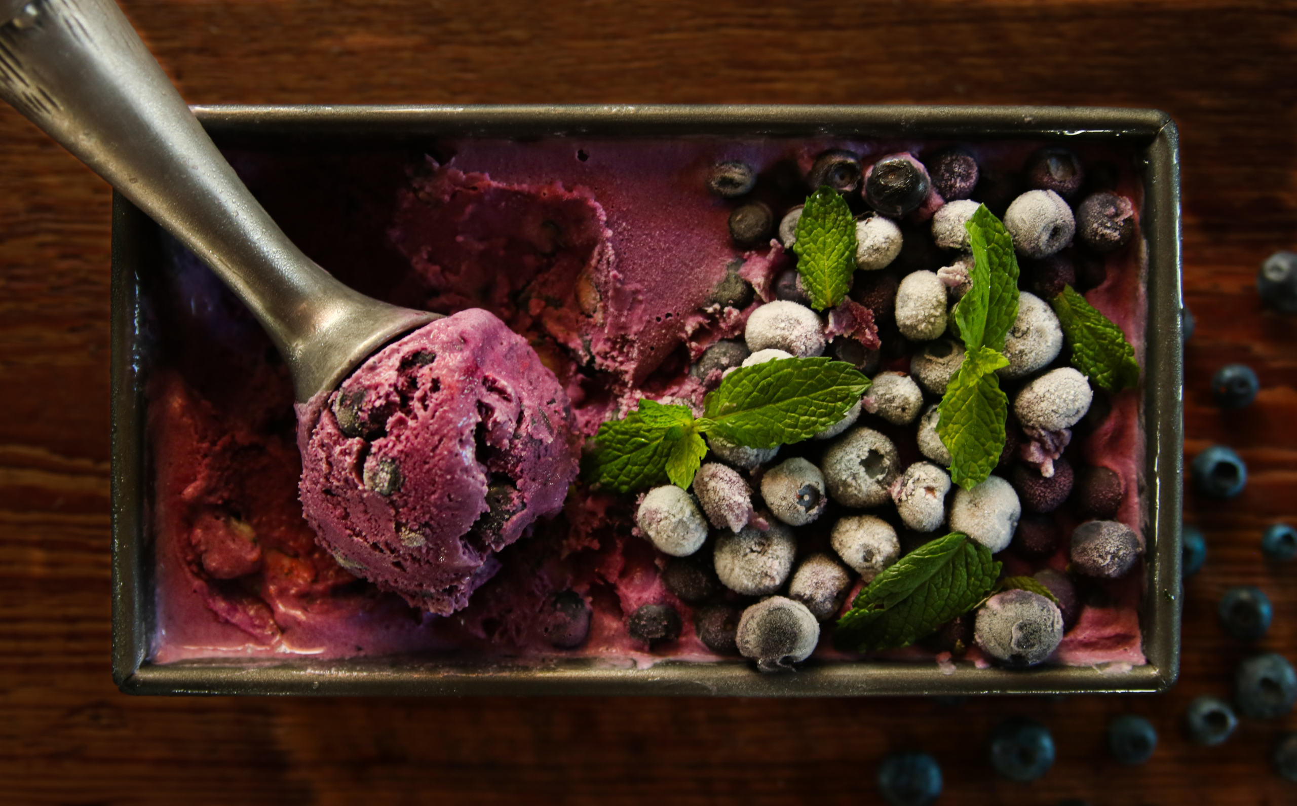 4. Scape the ice cream into any freezer safe container. Continue to spread out until smooth. Garnish the top of your ice cream with the extra blueberries you have and cover container with plastic wrap. Put back into the freezer for about 2-3 hours until ice cream in firm. Garnish with mint and serve.
