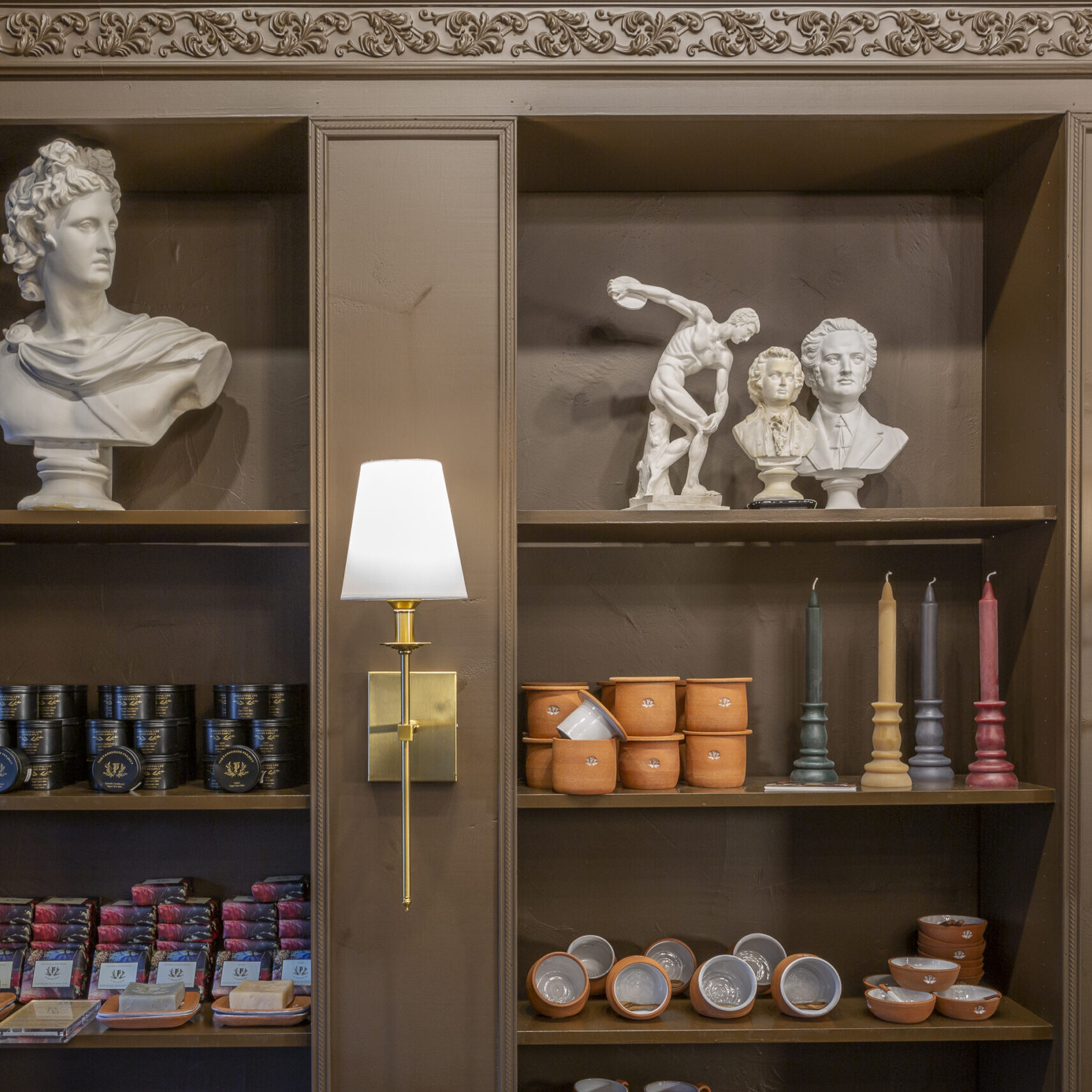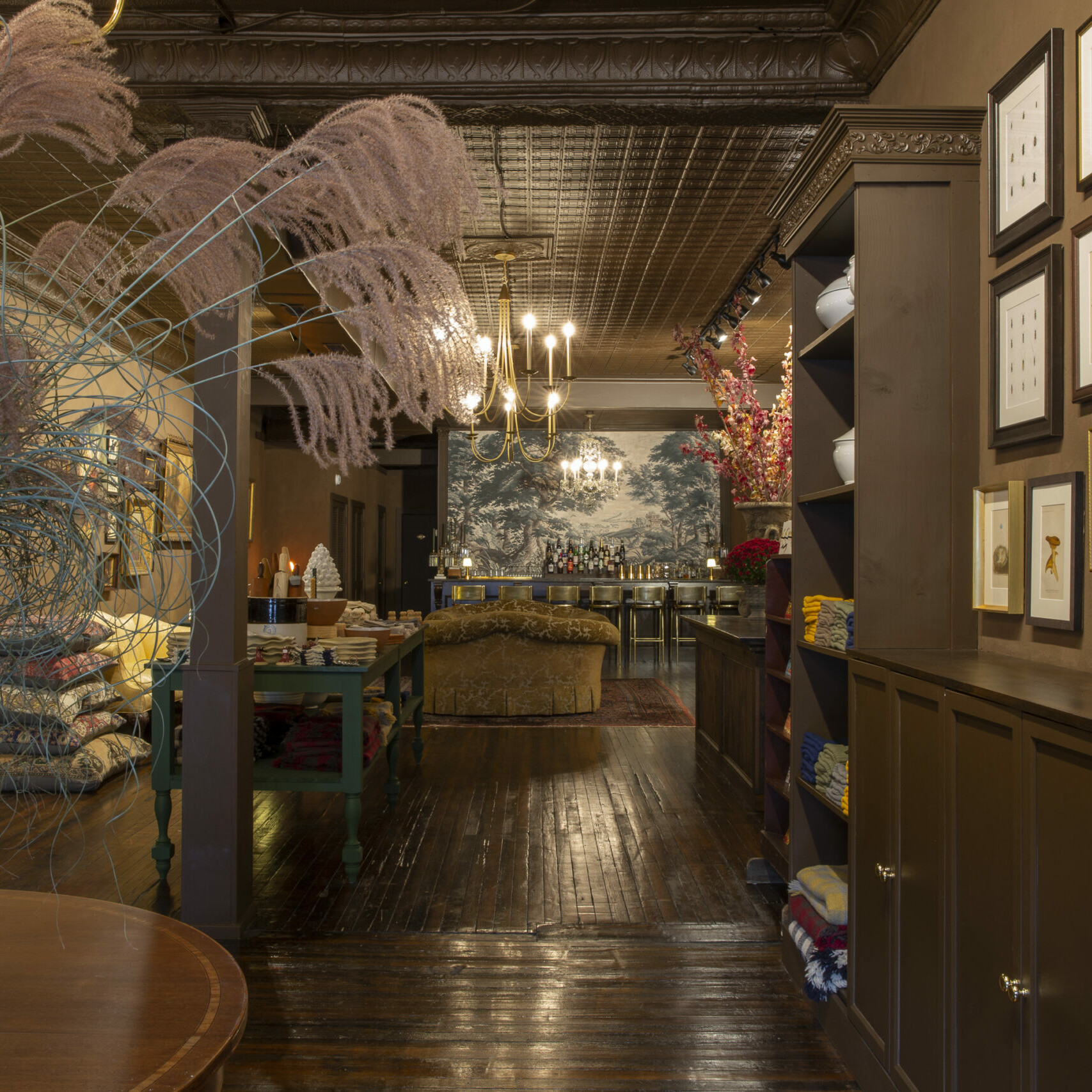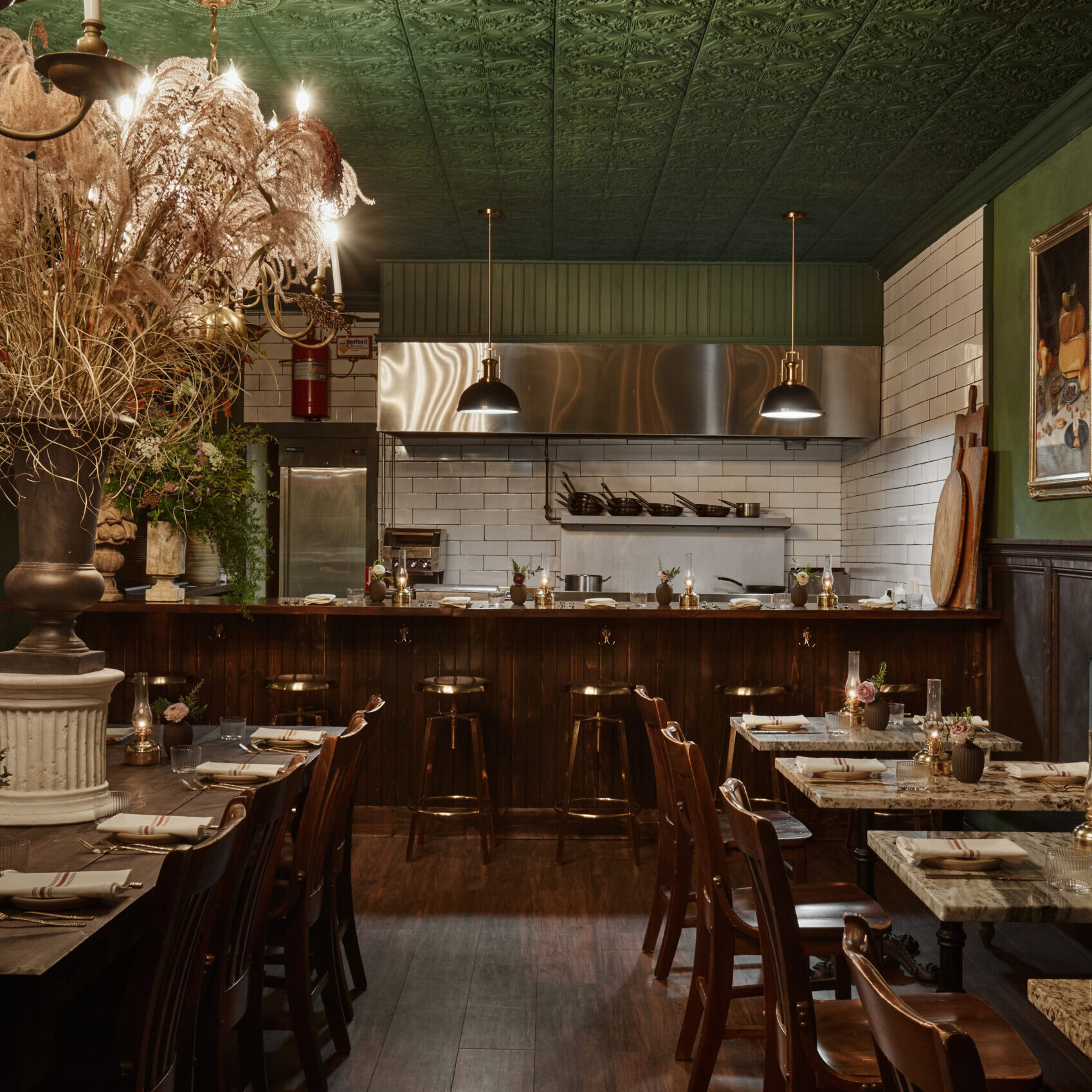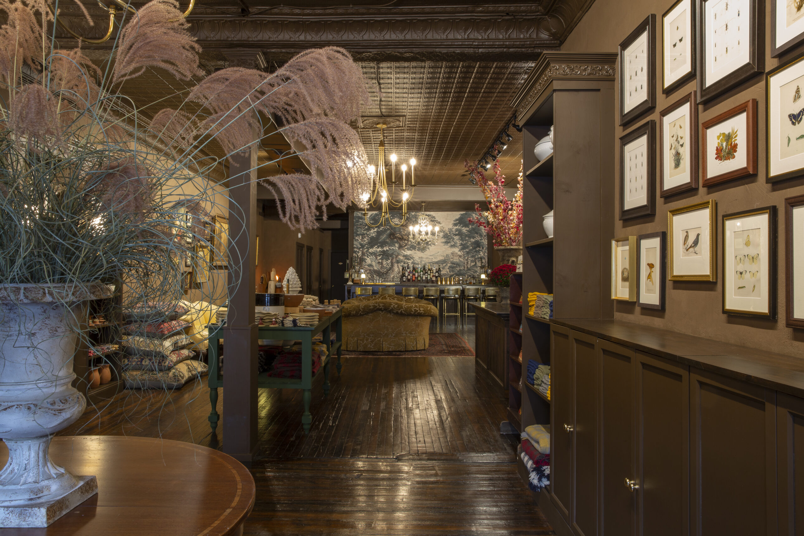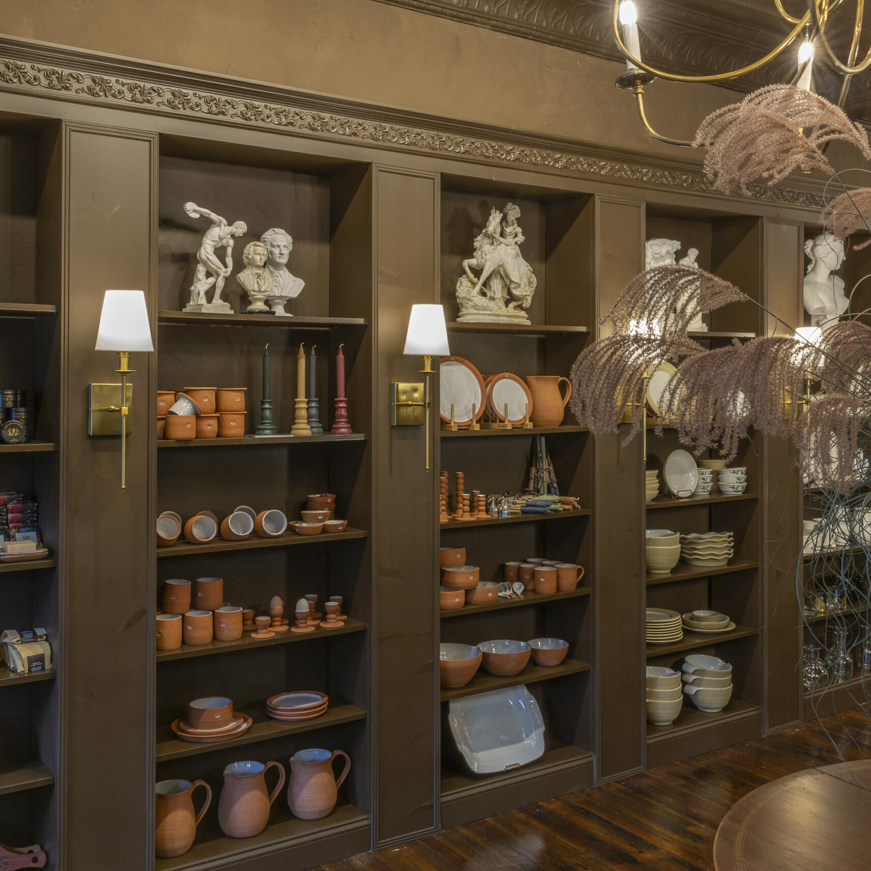 Step into a world of Roman Clay walls, European murals, and grand tin ceilings, evoking the elegance of a Regency-era hotel lobby. Browse unique products, relax on antique sofas, or indulge in our inviting dining room and open kitchen, where Executive Chef and Co-owner Camille Rodriguez crafts enticing seasonal Mediterranean dishes.