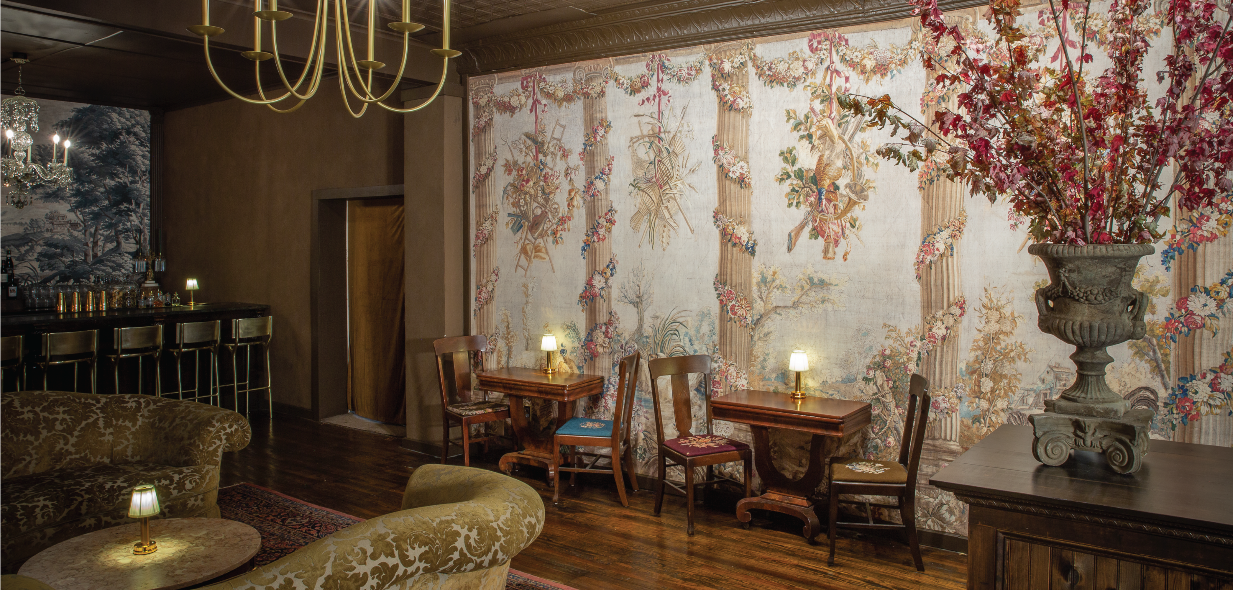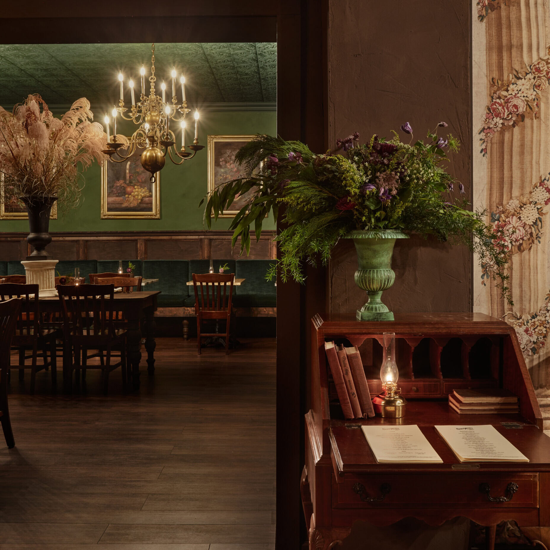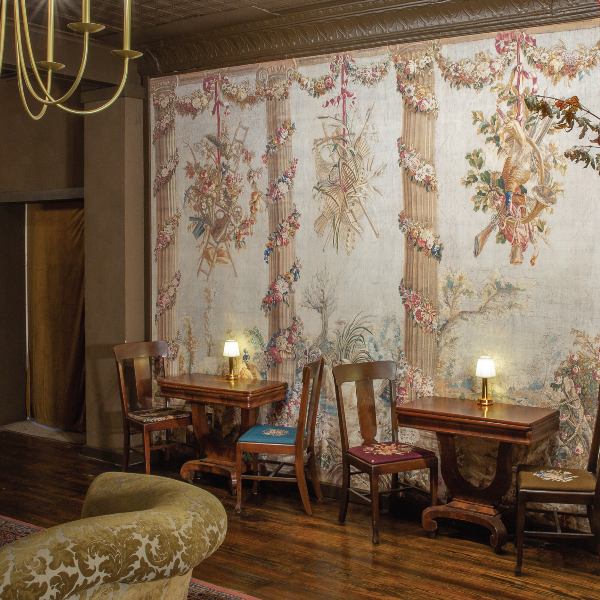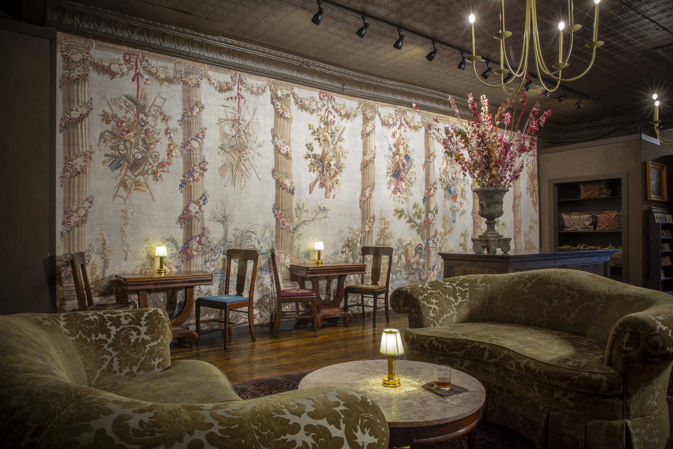 Step into a world of Roman Clay walls, European murals, and grand tin ceilings, evoking the elegance of a Regency-era hotel lobby. Browse unique products, relax on antique sofas, or indulge in our inviting dining room and open kitchen, where Executive Chef and Co-owner Camille Rodriguez crafts enticing seasonal Mediterranean dishes.