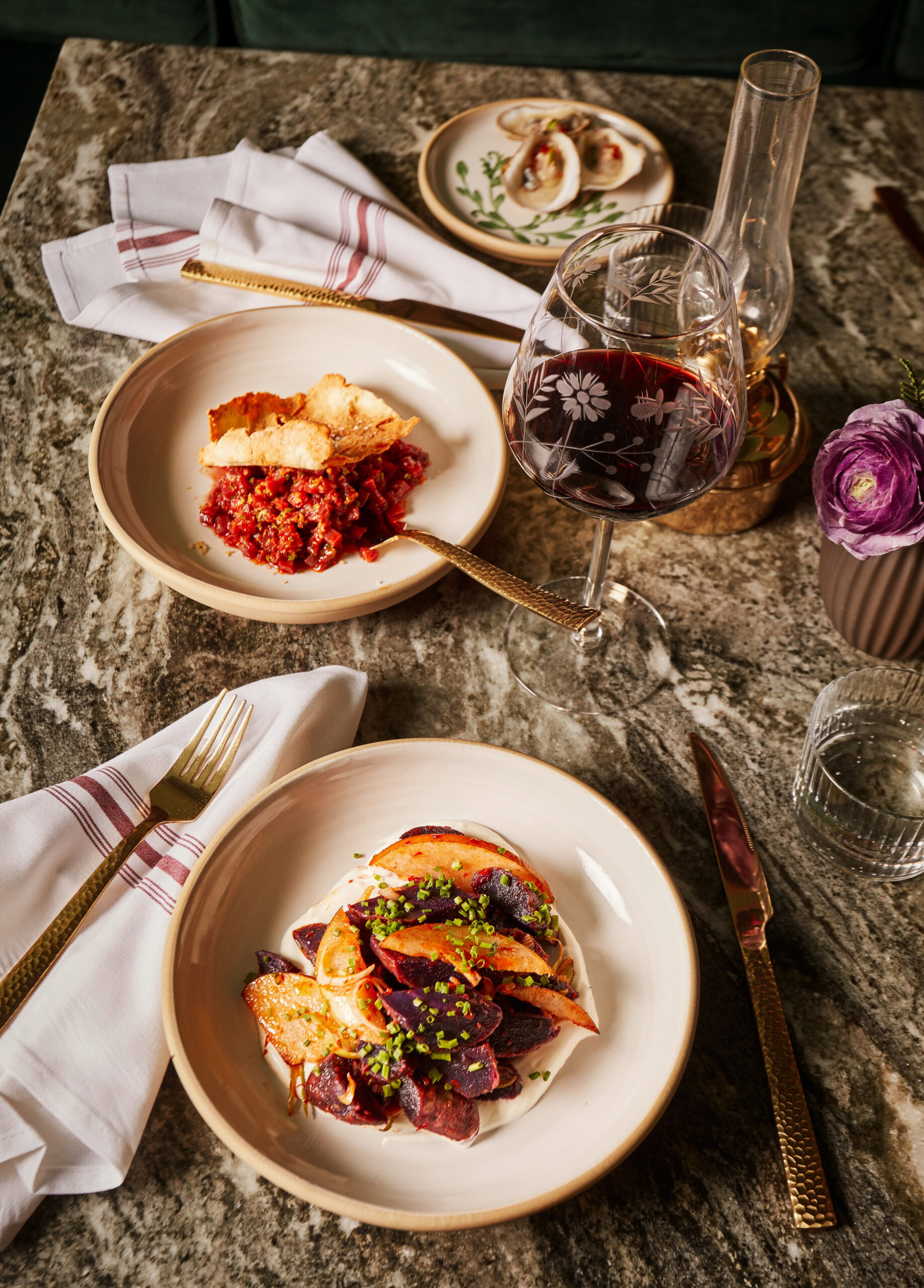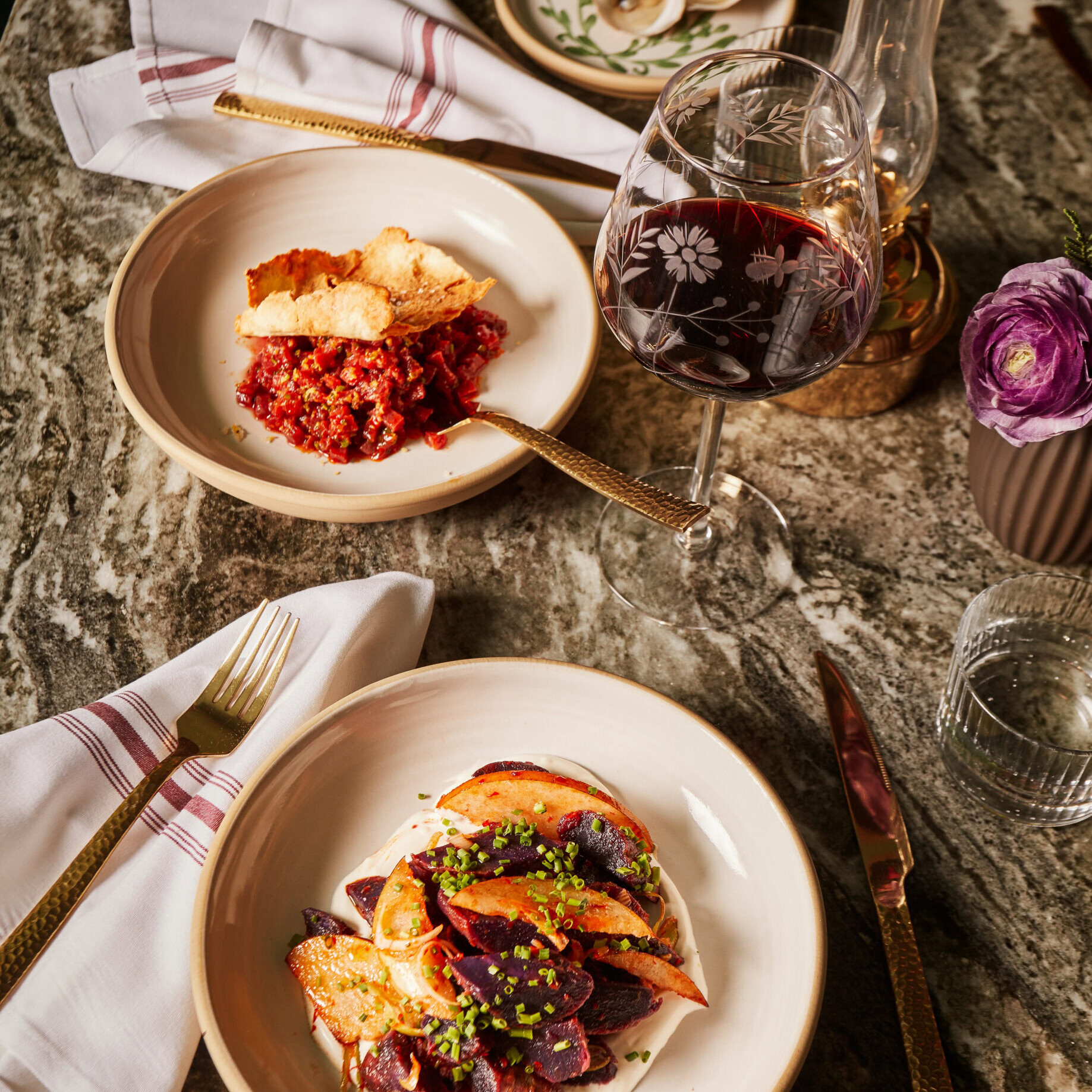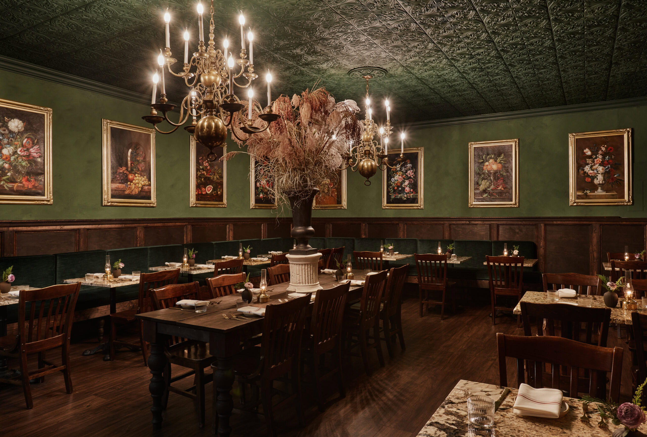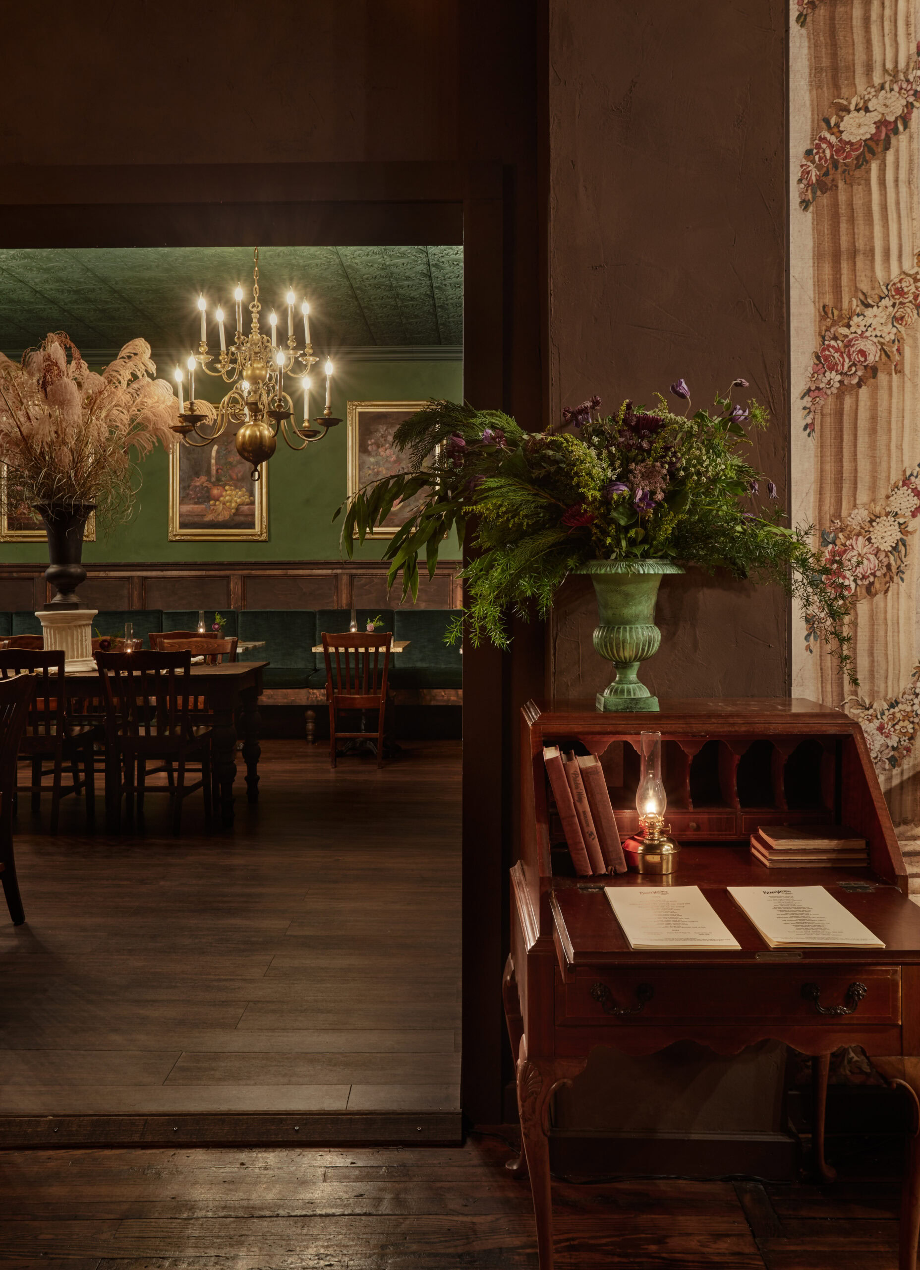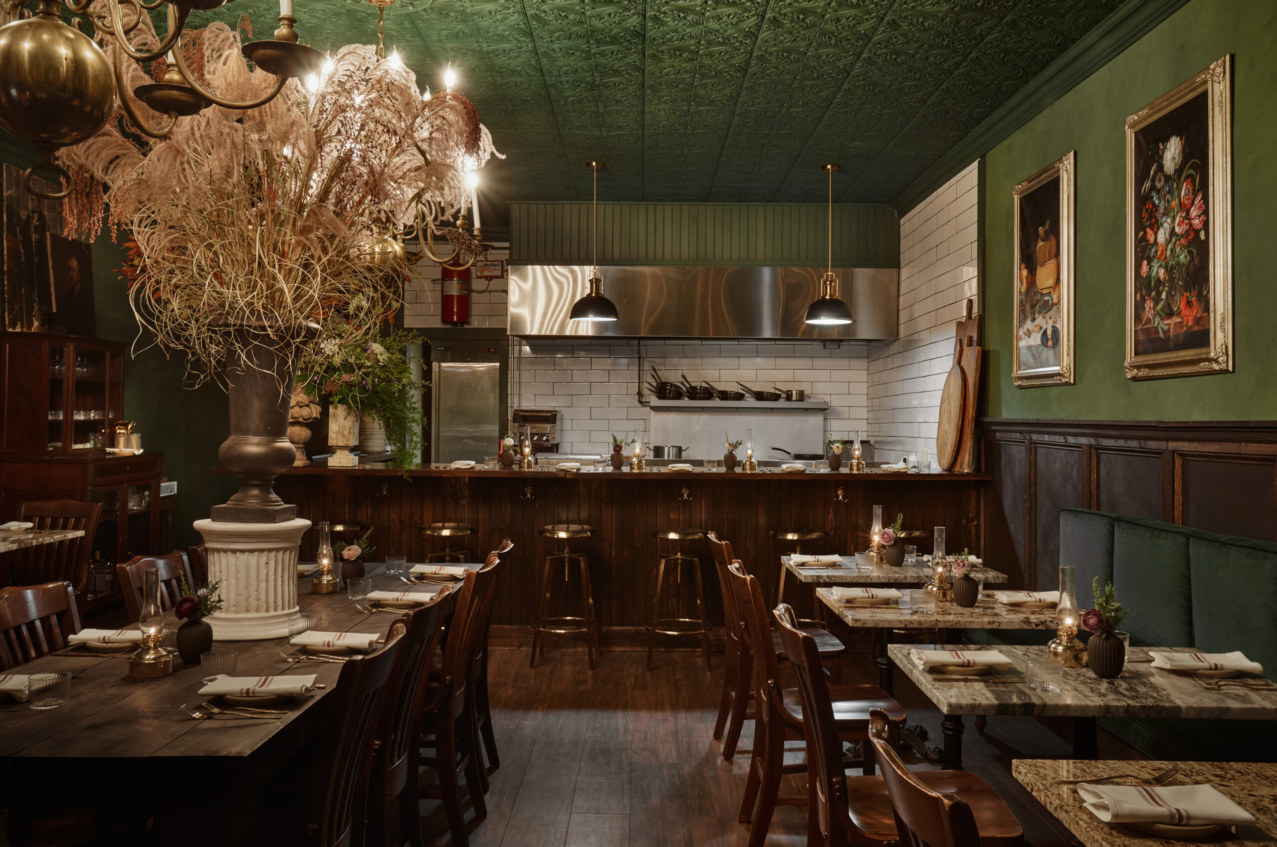 Step into a world of Roman Clay walls, European murals, and grand tin ceilings, evoking the elegance of a Regency-era hotel lobby. Browse unique products, relax on antique sofas, or indulge in our inviting dining room and open kitchen, where Executive Chef and Co-owner Camille Rodriguez crafts enticing seasonal Mediterranean dishes.