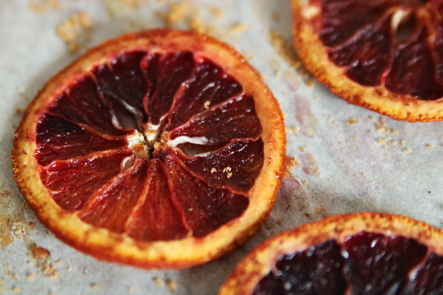 Easy oven-dried orange slices. Sprinkled with spices and brown sugar, these candied orange slices are the perfect garnish for baking and cocktails, and are beautiful just on their own. We used our favorite blood oranges since they have such a short season. Their deep rich colors are so gorgeous this time of year. Follow our simple recipe below…