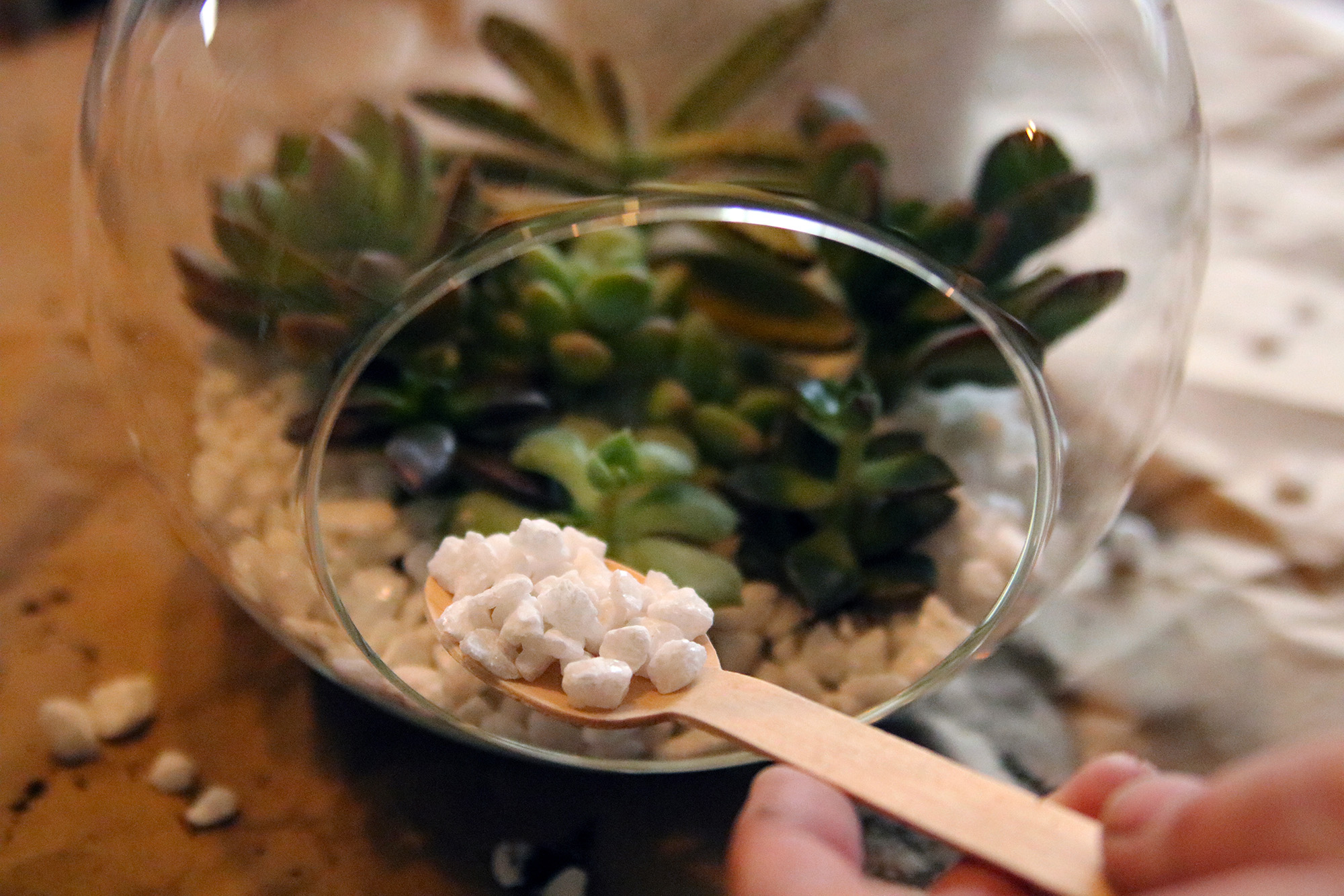 - Place 1-2 succulents towards the back and sprinkle a few more pebbles to cover their roots. Use a small spoon to help scoop out the pebbles where your fingers can’t reach.