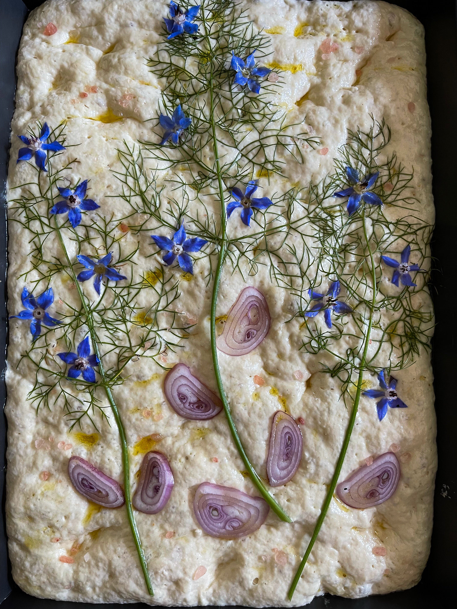 Bread baking, unlike most forms of cooking, relies on exact measurements and cooking times. There is a level of freedom with focaccia, however since it lends itself so well to toppings. In Italy, we even saw focaccia-topped hot dogs (perhaps for the plentitude of German hikers we saw in Cinque Terre?). In summer, we love to top our focaccia with fresh herbs, cherry tomatoes, onions, or even edible flowers! (note, the flowers don’t bake as pretty as you cut them) You can also keep it simple, using the best quality ingredients currently in season. The trick to our focaccia’s fluffy texture is the addition of potato to the dough and allowing plenty of time for the bread to completely rise.