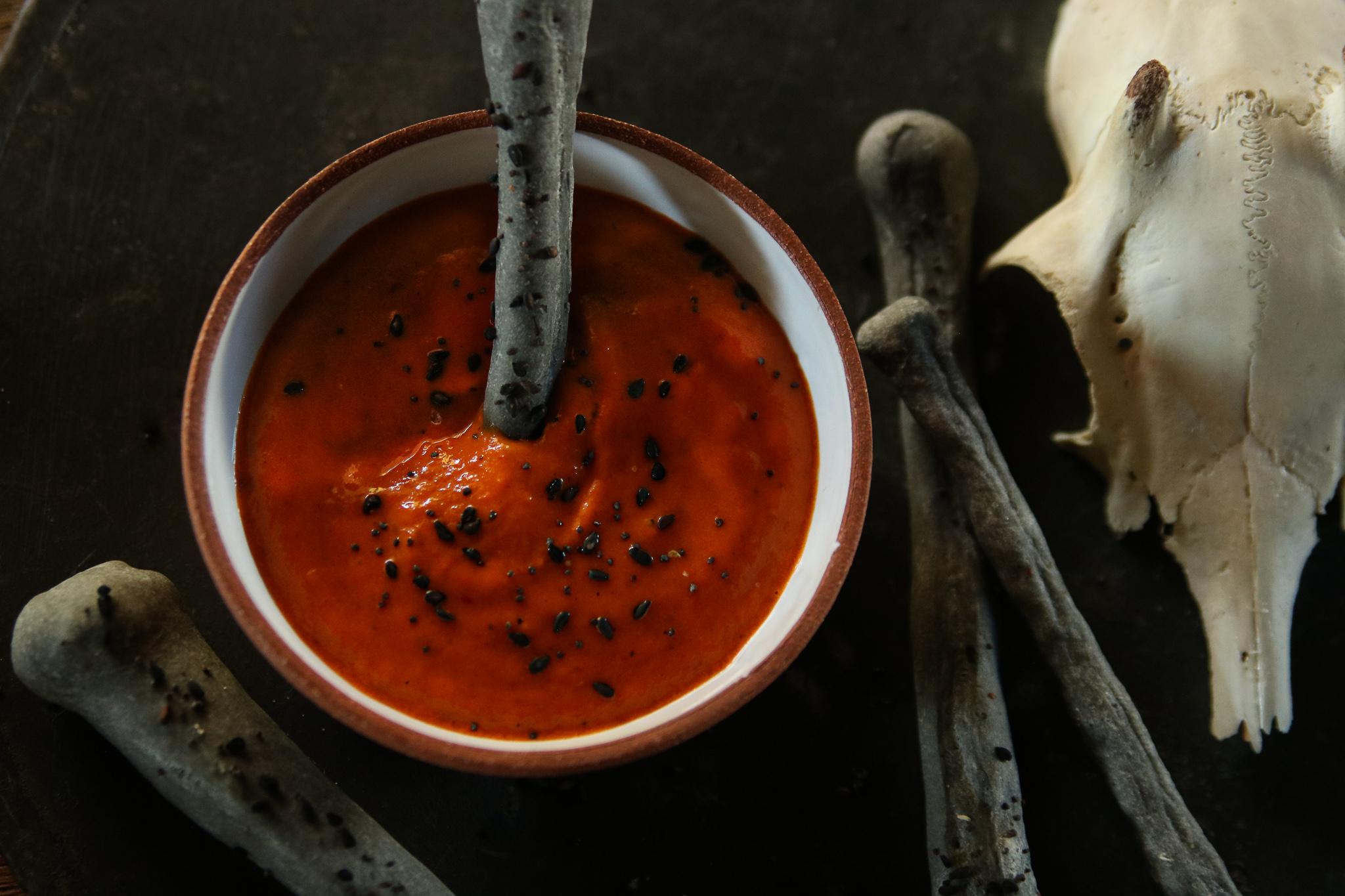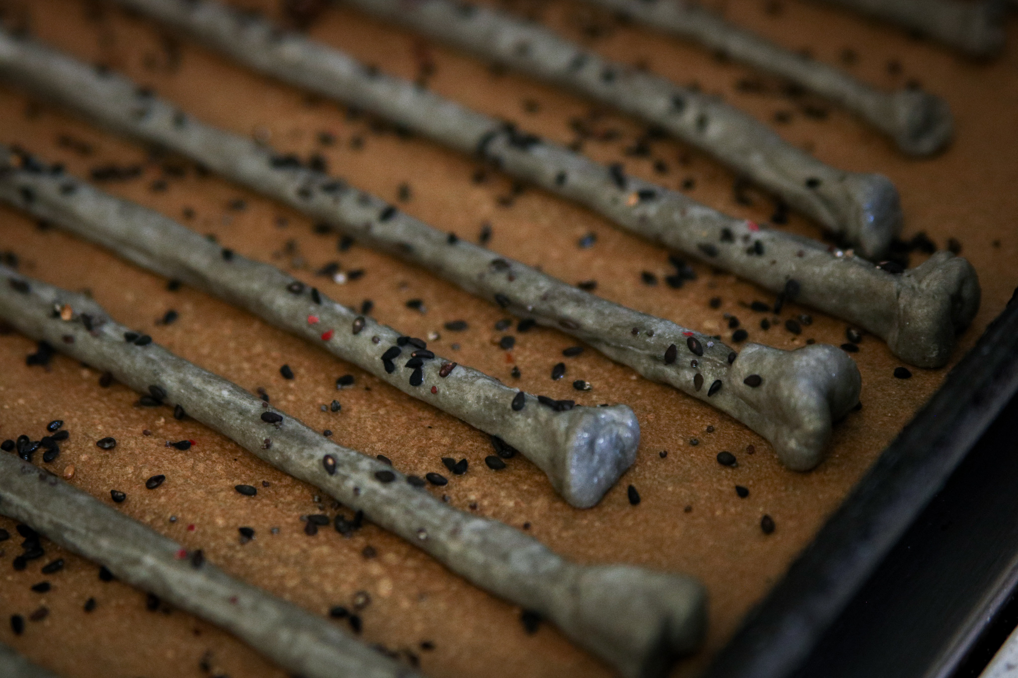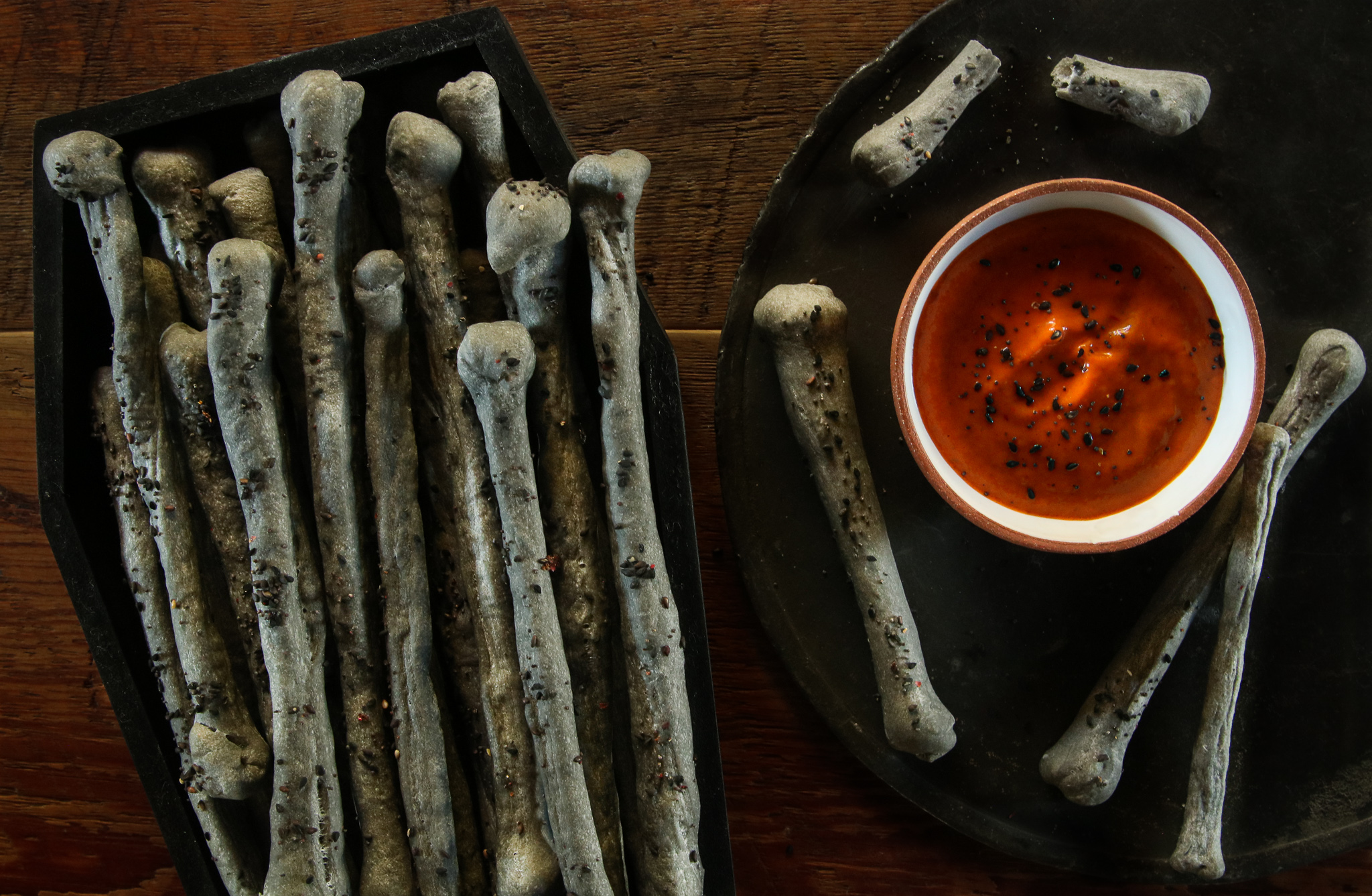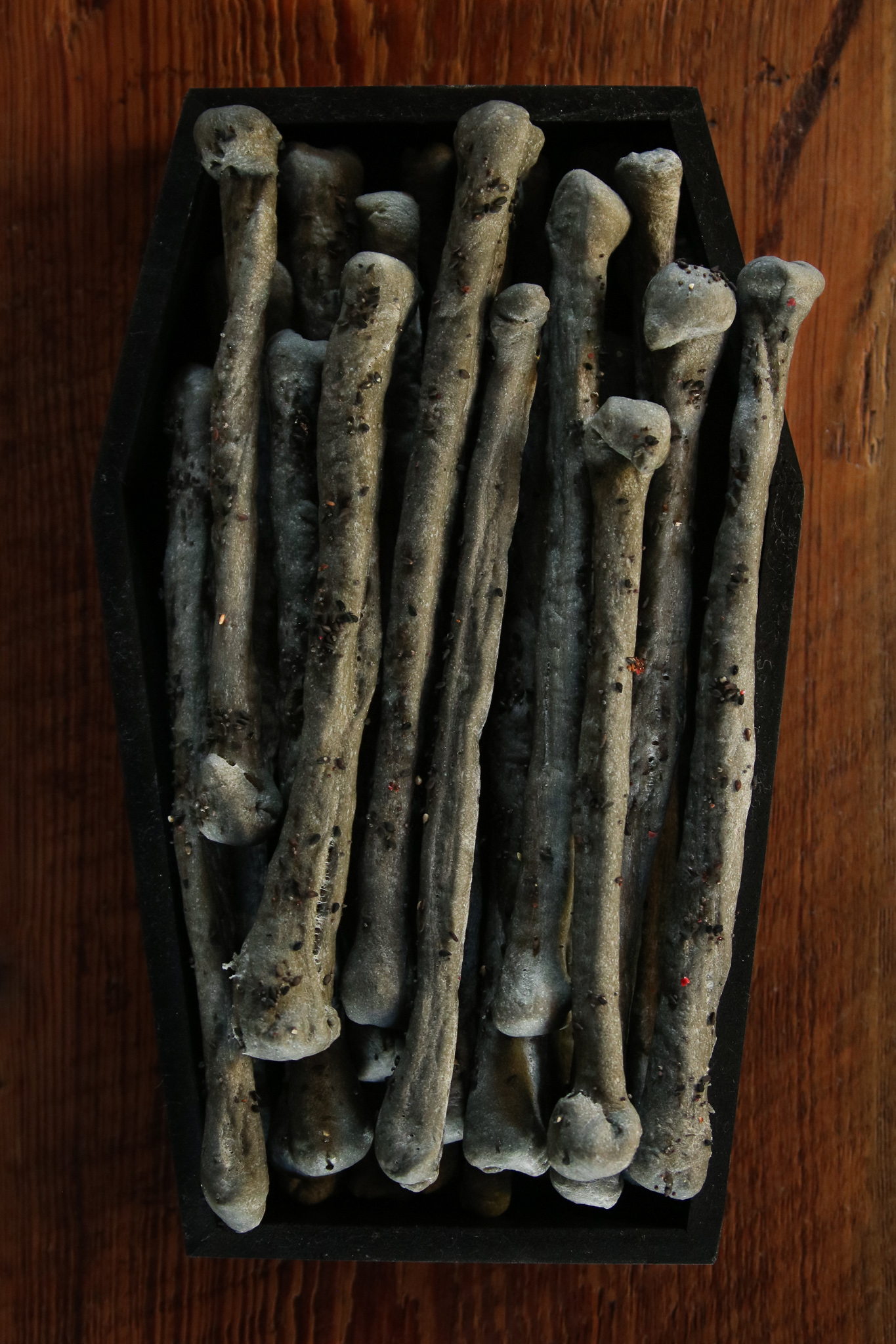 For a fantastic Halloween treat we’ve added activated charcoal to our recipe for a deliciously creepy breadstick that resembles skeletal bones. As an alternative to charcoal, you can also use a packet of squid ink that will give you a darker grey/black color. We dressed up our Halloween bone breadsticks with black sesame seeds, nigella, and smoked salt.