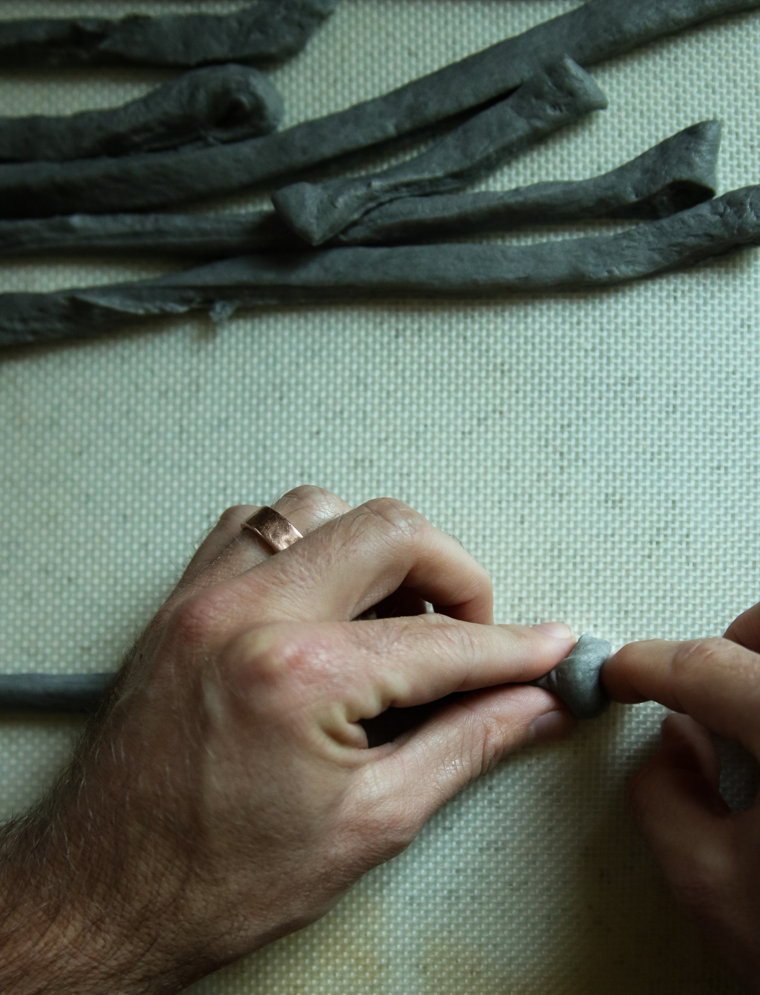 4. Shaping. You’re probably going to want to work in batches: remove half the dough from the bowl and roll it out to form something resembling a rectangle. Using a pizza cutter or sharp knife cut thin strips about 10-12” long, keeping in mind the size of your baking tray. Roll the strips on your work surface (you may need to lightly flour your hands) until you have a more cylindrical shape. They don’t have to be perfect…in fact they look better a little wonky. Your breadsticks should be about pencil thin for a crisp breadstick. For an authentic "bone" shape, hold the tip of your breadstick about 1" from the end with two fingers. With your other hand, use your index finger to push down creating a nub at each end. You can shape the ends more by hand to resemble the bones epiphysis, just don't make the ends too thick or they won't bake evenly.