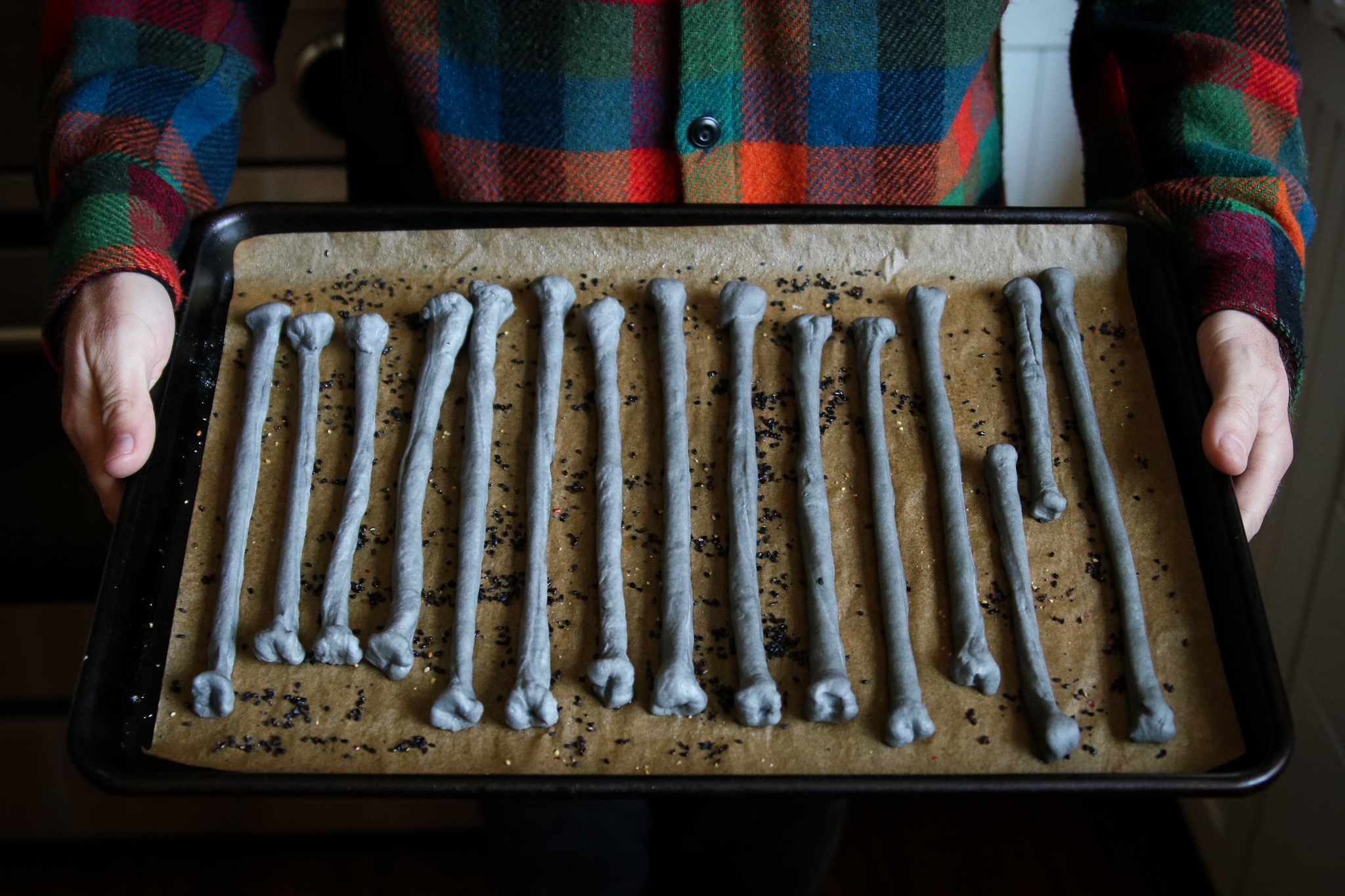 For a fantastic Halloween treat we’ve added activated charcoal to our recipe for a deliciously creepy breadstick that resembles skeletal bones. As an alternative to charcoal, you can also use a packet of squid ink that will give you a darker grey/black color. We dressed up our Halloween bone breadsticks with black sesame seeds, nigella, and smoked salt.