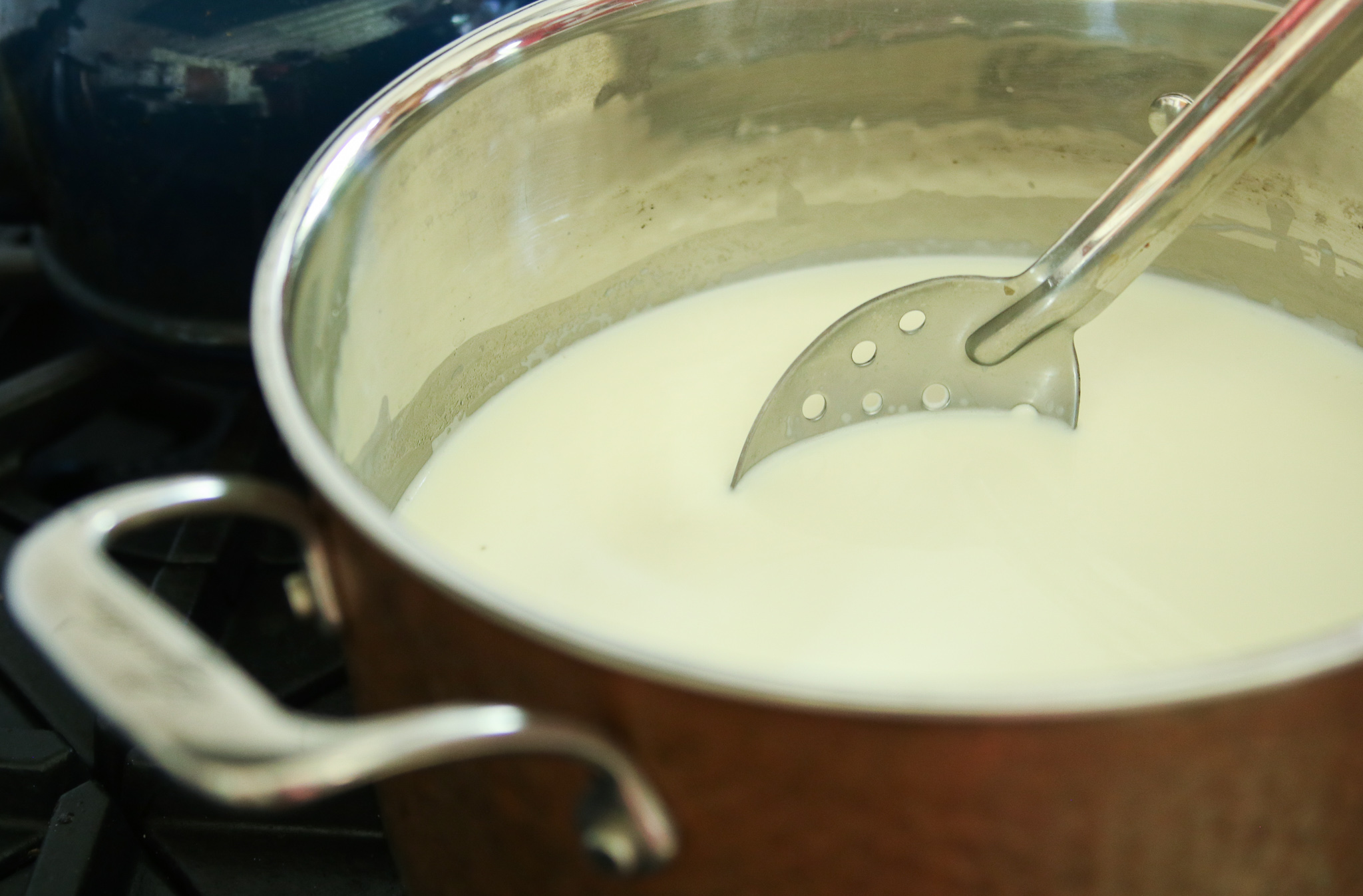 - Pour the milk and cream into the saucepan and set over medium heat. Bring the milk to a bare simmer— just below the boil at around 200°F. Stir occasionally, scraping the bottom of the pot to make sure the milk doesn't scald. When ready, the mixture will look foamy and steamy.
