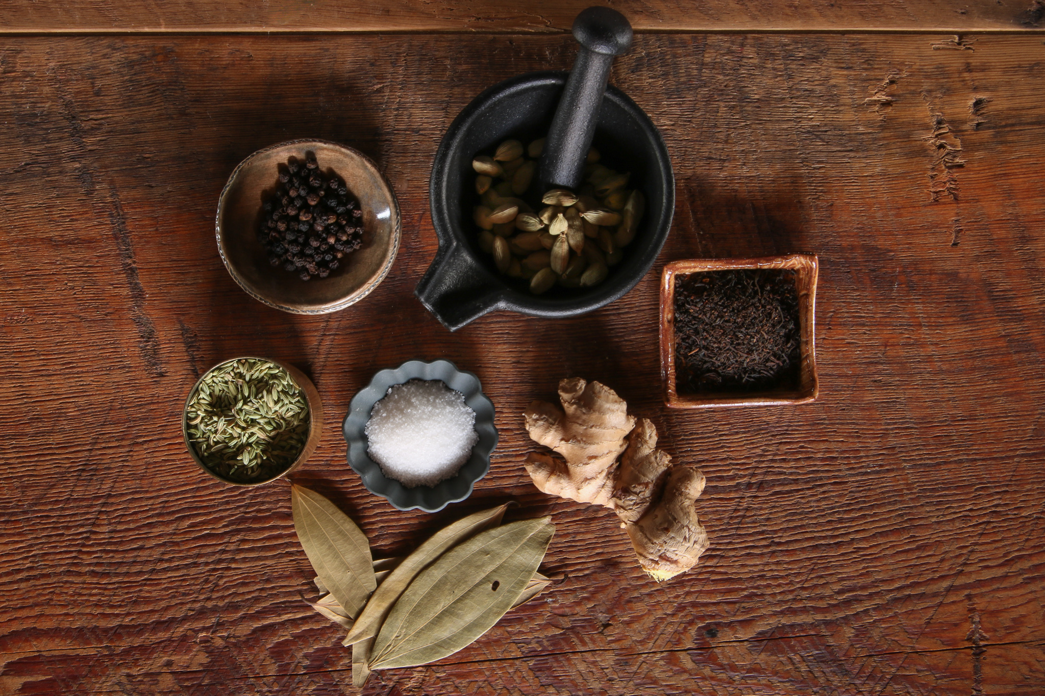 Crush together cardamom, black pepper, and fennel seed using a mortar and pestle. Separately, smash the ginger piece (a meat tenderizing hammer works well for this).