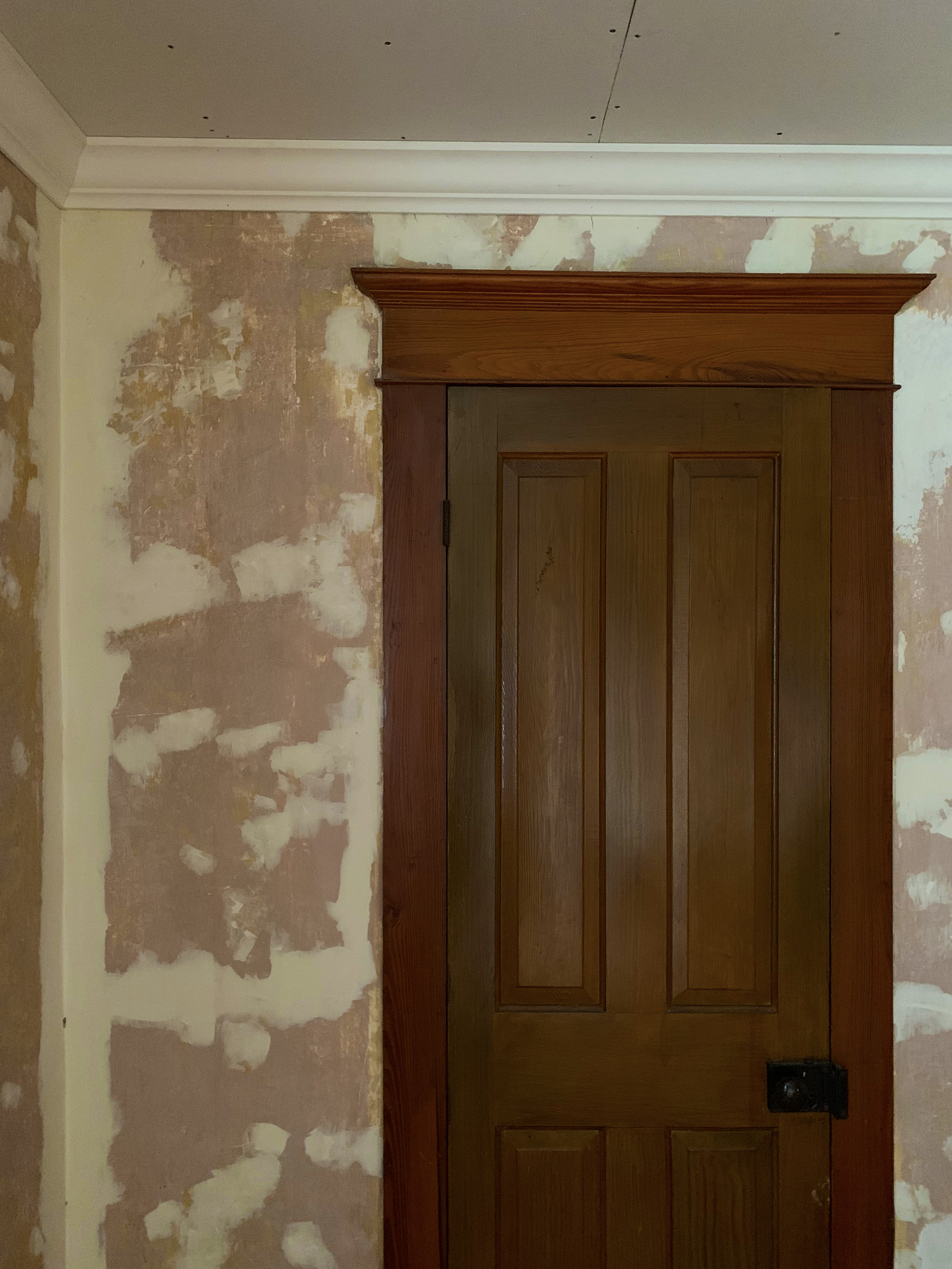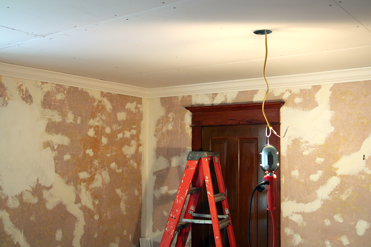 It’s week numero 3 with our One Room Challenge bedroom makeover! We’re behind with wallpaper and painting but we got the ceiling drywall up and the crown moulding and electrical all sorted out. Still unsure why, when they originally added electricity to the house, they would put the outlets and switches so high! Like 5ft high!