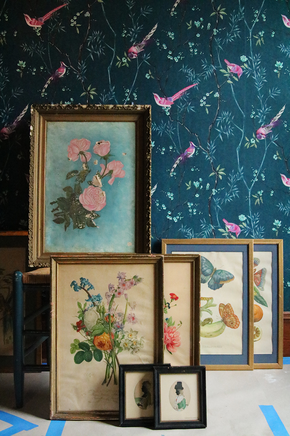 Art usually plays a big part in designing a room. Most times a piece we collect for the farmhouse helps establish a room’s color palette or theme. I was in a bit of a panic about the artwork for our ORC makeover when I realized I’ve been hoarding some beautiful botanical pieces in the barn that would work perfectly. Most of these finds we scored at yard sales for a few dollars. If you haven’t noticed, we do have a love for historic studies and illustrations, particularly botanicals and works inspired by the great American naturalist and painter, John James Audubon. If you find some originals you’ll see that most of them were hand painted and truly spectacular.