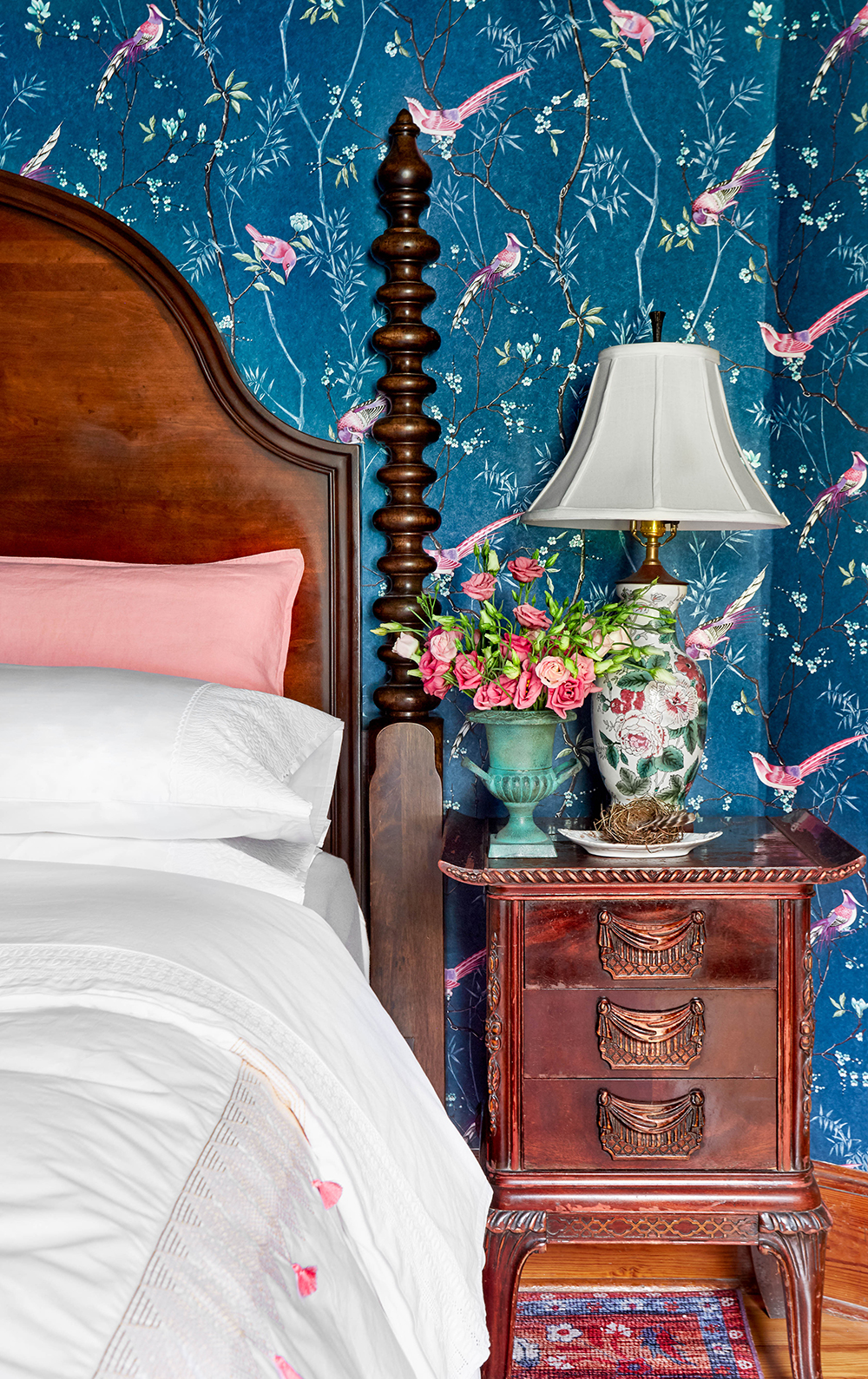 The bedroom makeover’s theme started with the fabulous chinoiserie wallpaper from Graham & Brown. We knew we wanted to incorporate this 18th century Chinese motif into our bedroom and fell in love with their Tori Teal pattern’s interpretation that was hand designed in their studio in England. The design is traditional with an updated moody color palette that worked seamlessly with our historic farmhouse and overall style esthetic. We incorporated a versatile mix of new and antique furnishings and accents with a beautiful and minimal design approach.