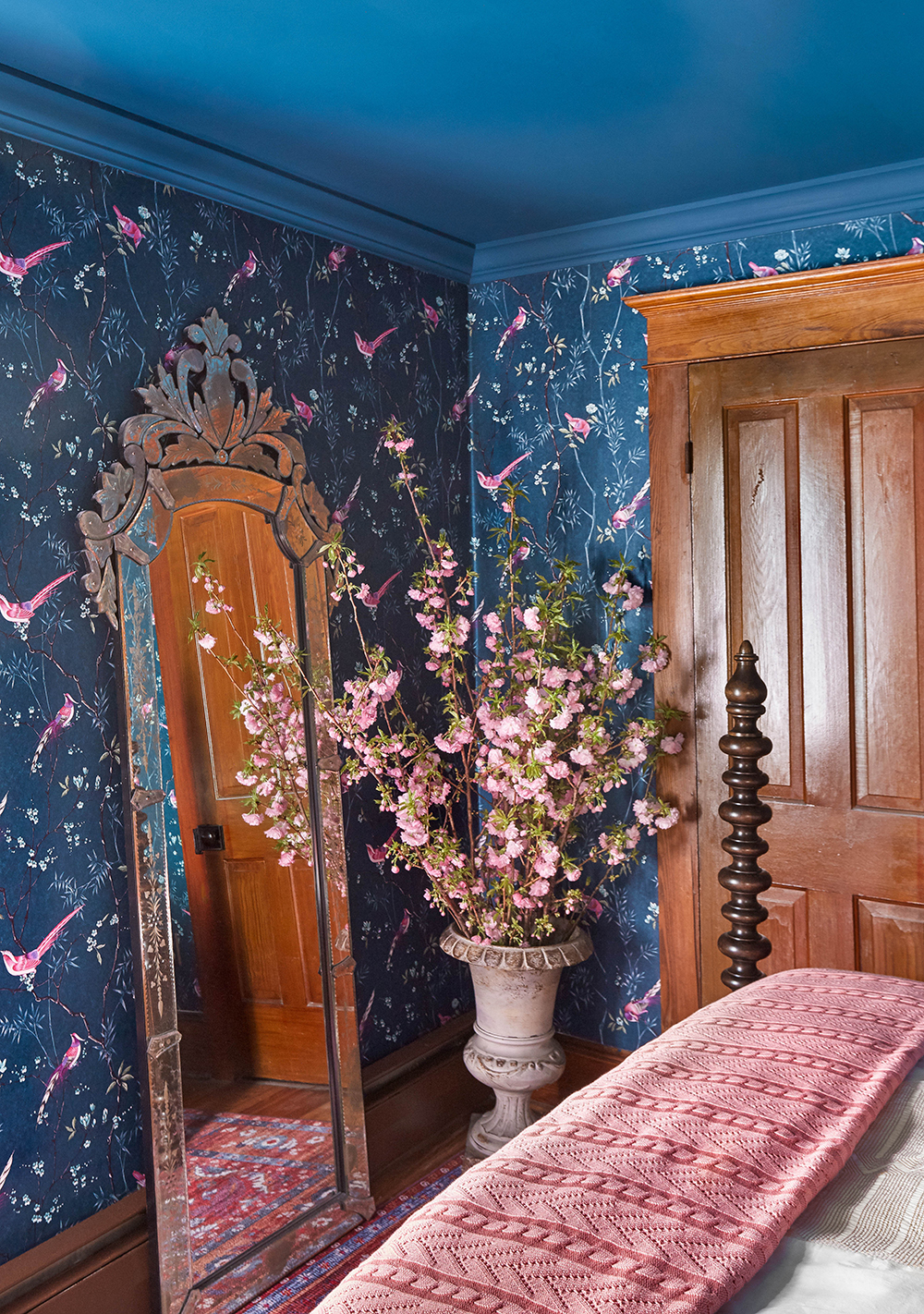 Wow I love the bold colors. It has a french and bohemian feel to it. The warm tones of the wood look awesome against the bold blue wall paper. LOVE IT!!!!