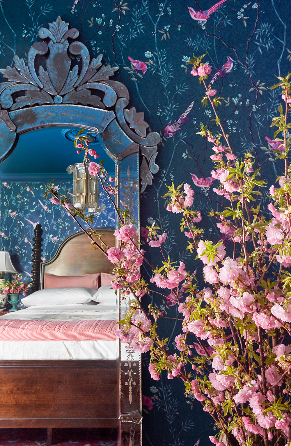 Absolutely gorgeous!! And that Venetian-style mirror — perfection! I love everything about this room, but it would be hard to turn off the lights each night. Too much beauty to absorb! Well done! 😉