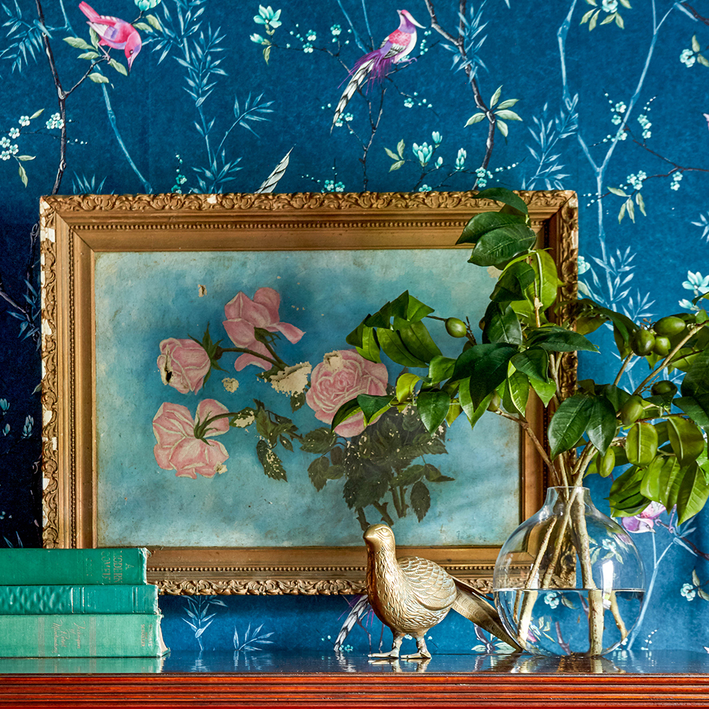 The Tori collection depicts an exquisite Chinoiserie bird trail delicately hand painted in our studio and worked into a fine silk texture. In Eastern Art, birds are also an important and popular form of imagery and symbolism, signifying longevity, luck and love. Produced in a deep regal teal on a luxurious Oriental paper with a subtle glistening shimmer of silk.