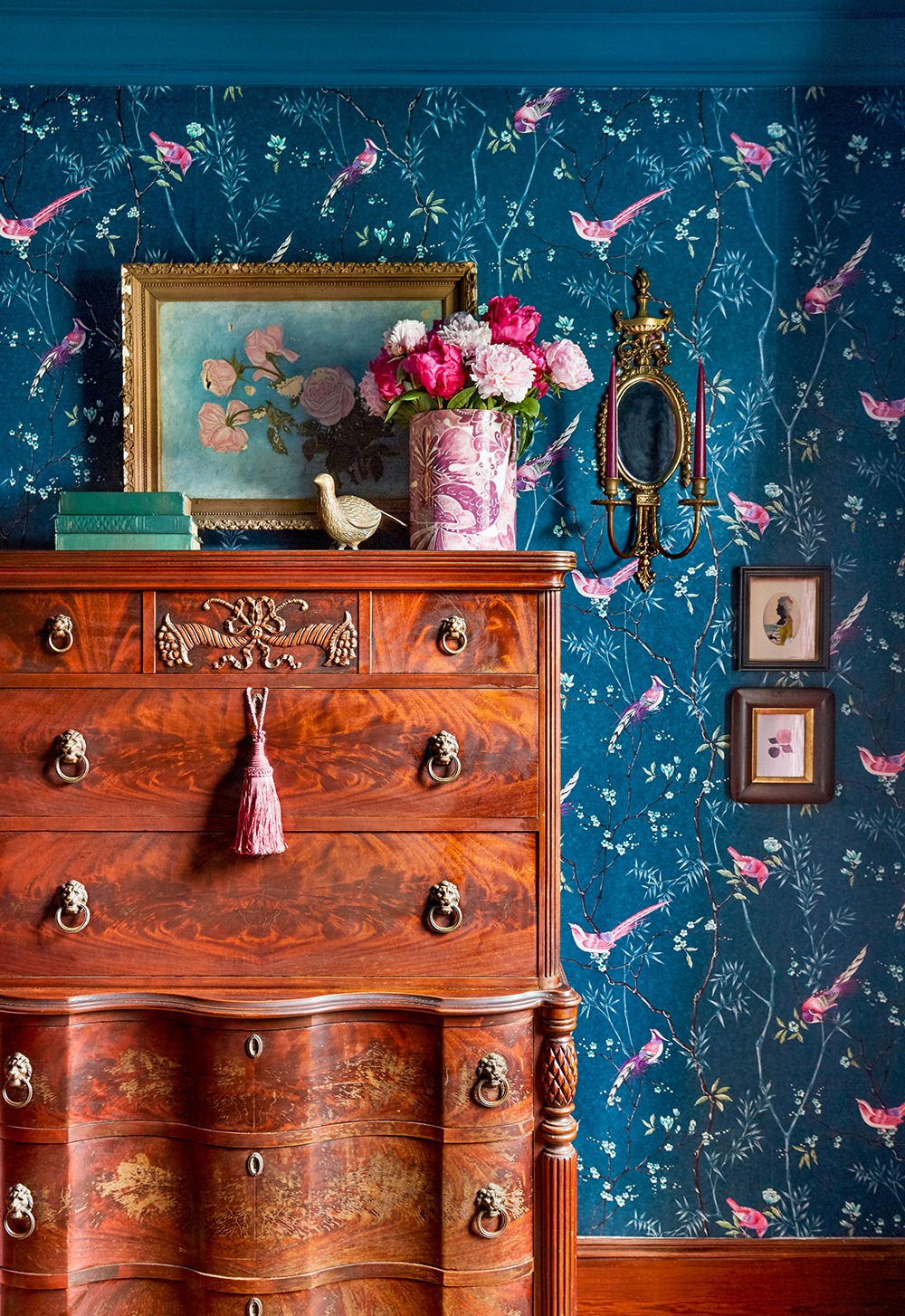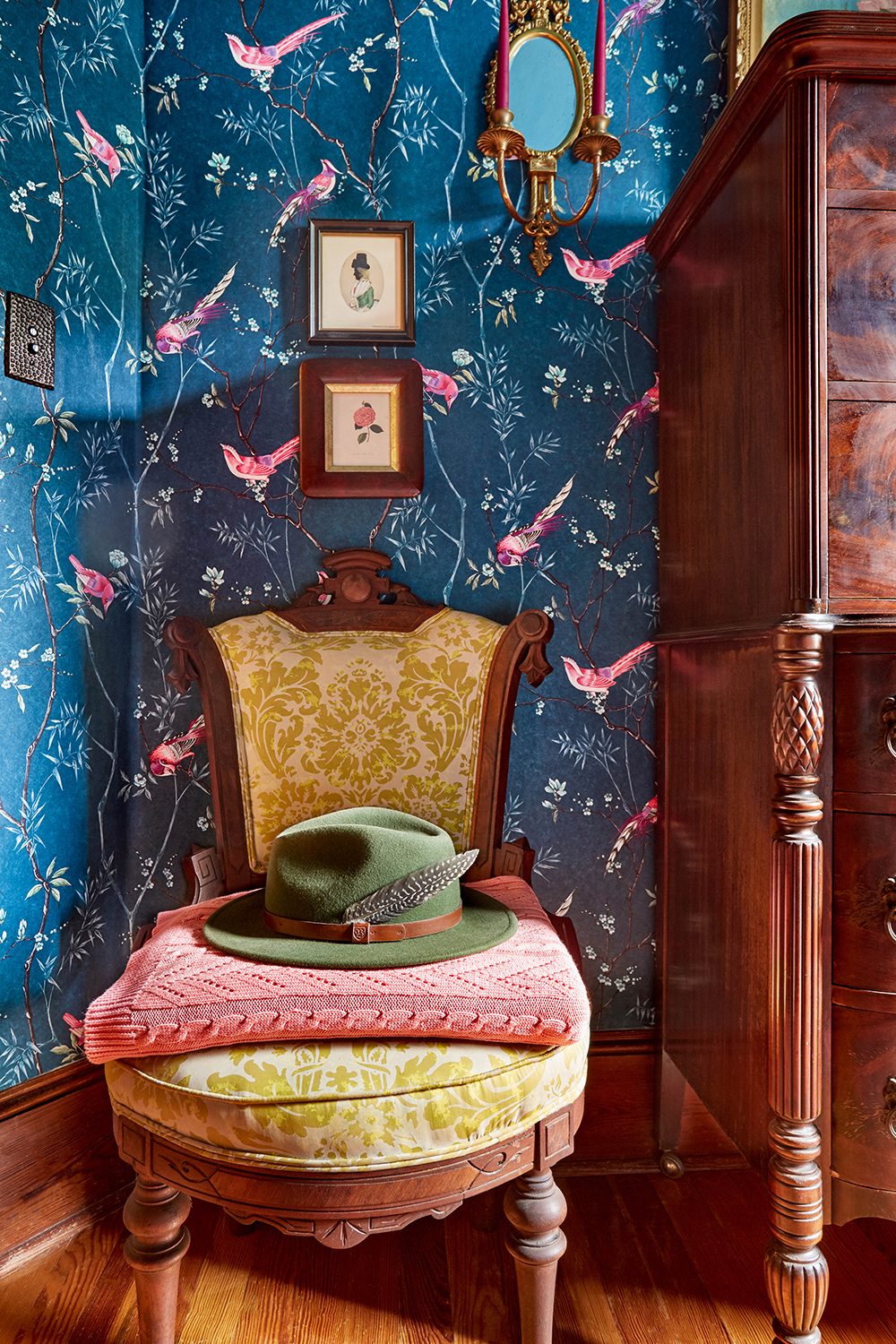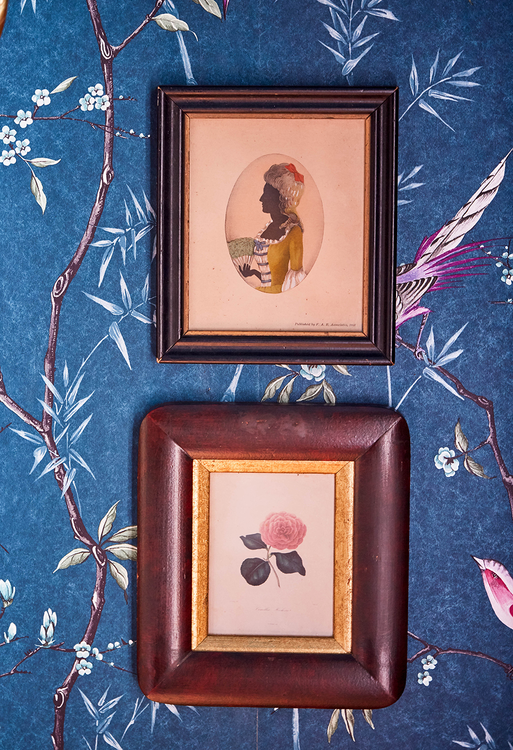 At first, I was in a panic for artwork. I’m always drawn to vintage botanicals and actually found a bunch of them that I collected at yard sales in our barn. I quickly realized that we didn’t need much artwork on the walls because the Chinoiserie wallpaper was so beautiful on its own.