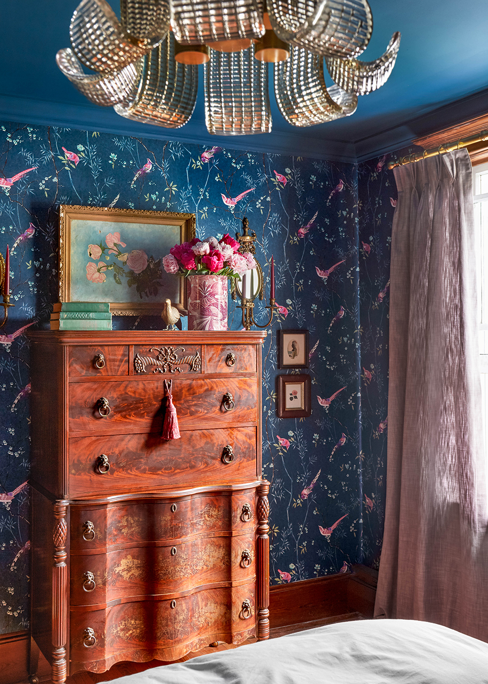 You have a lovely aesthetic. I admire your bravery with color. It is very refreshing in the current neutral design climate, I myself suffer from it! The room appears collected over time, thoughtfully layered. The wallpaper is gorgeous. My favorite element is the chandelier, a bit Great Gatsby, like a sprinkling of fairy dust – its brilliant.