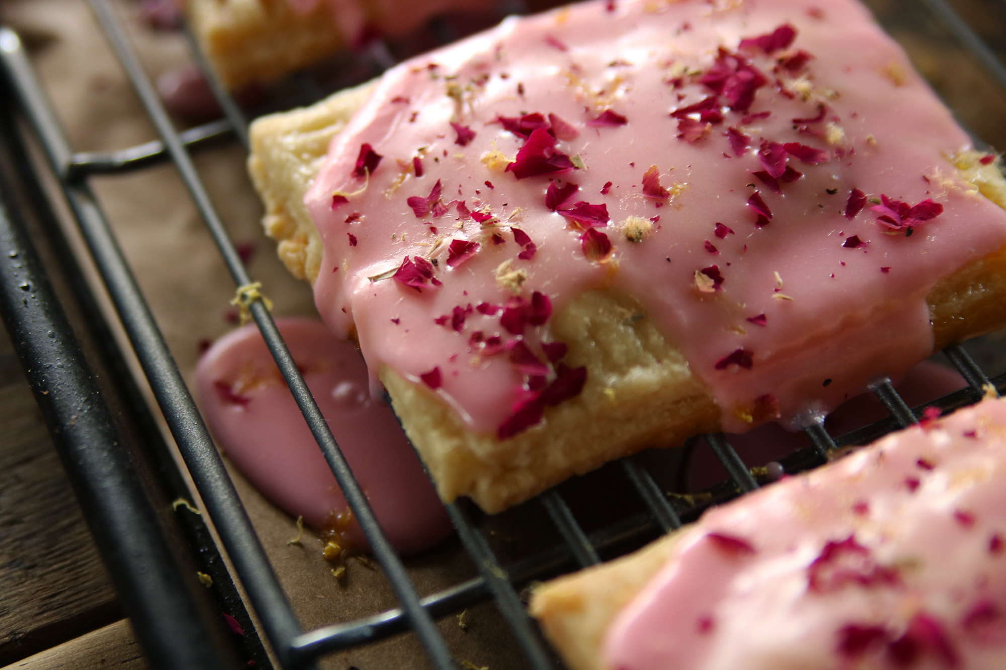 To bring us back to those wonderful memories of the 90’s we wanted to recreate a Pop-Tart with a fancier and more sophisticated flavor (yes, we’re very fancy gentlemen here at the farmhouse). What we love about this simple recipe is you can add your own unique flavors or the kiddos’ favorite fruit filling. As you’ll notice, the crust is a pretty standard pie crust recipe so you can always use your own. We had some lemon curd leftover from another baking project that pairs wonderfully with the rose water we usually use for cocktails.