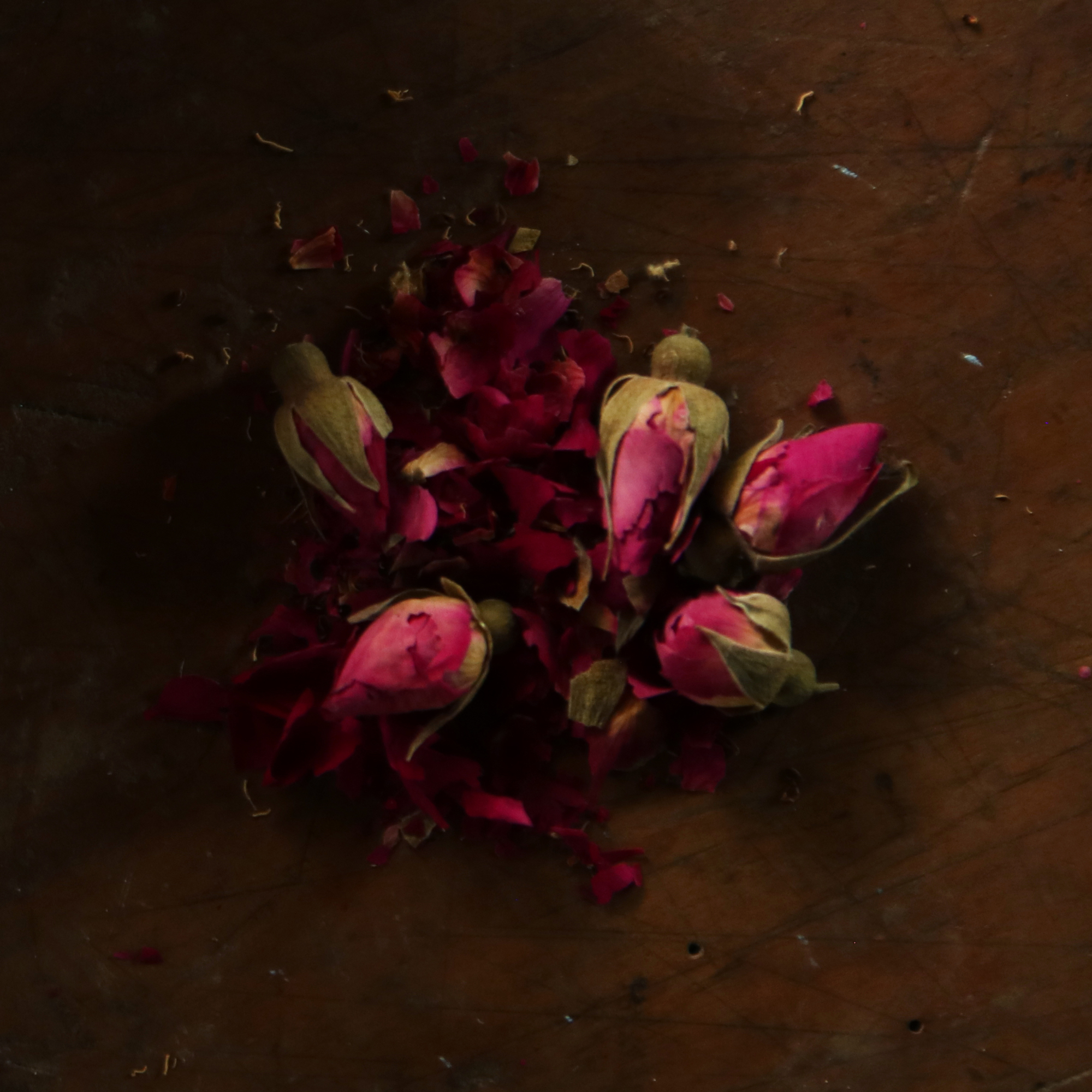 - Edible rose buds, chopped Chop or grind with a mortar and pestle. Edible rose buds can be found at a speciality spice shop or on Amazon.
