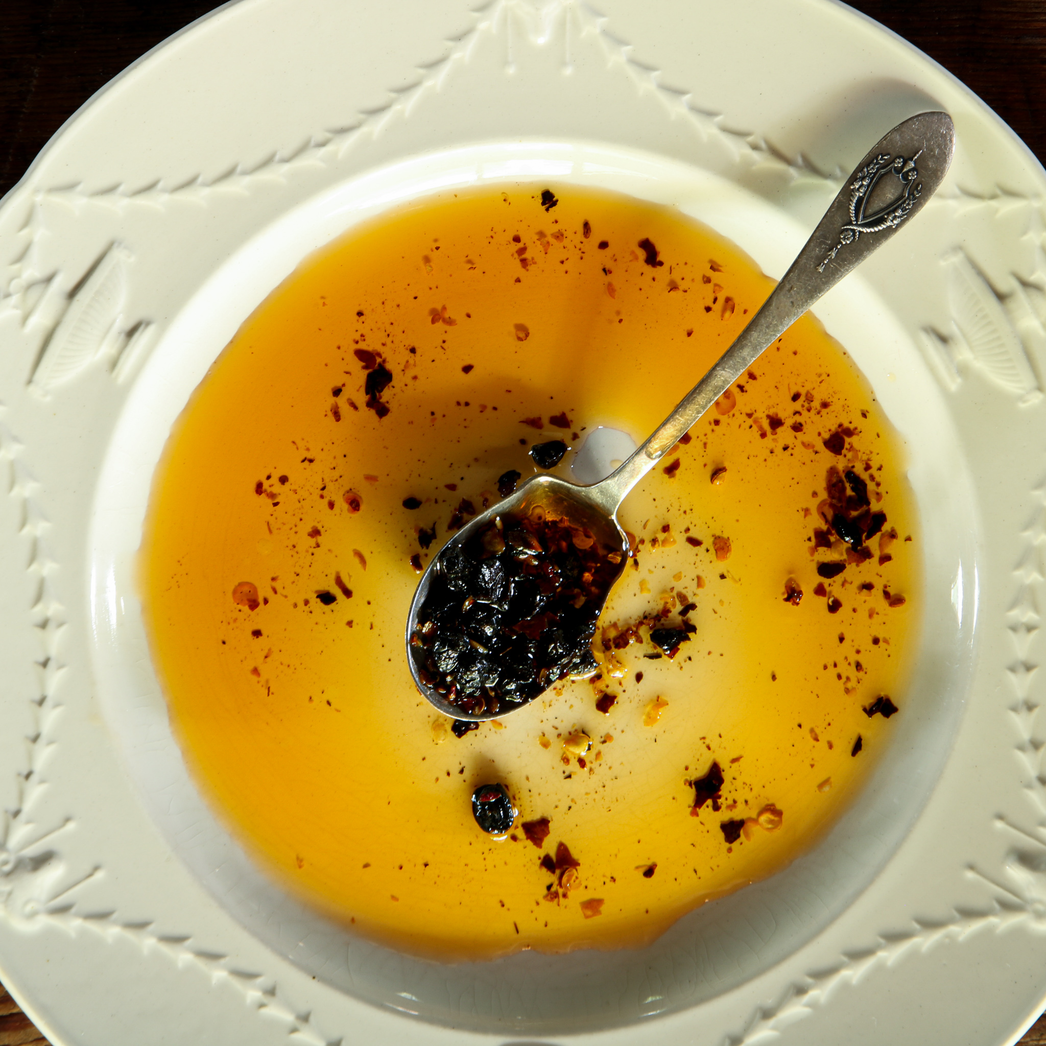 Our Sichuan Chili Oil is inspired by countless excursions to Chinese restaurants and dim-sum halls where every table features a jar of fragrant oil atop on an unctuous sediment of crushed red pepper flakes and Sichuan peppercorns. To this we add salty Chinese fermented black beans, tangerine peel, and a number of spices associated with the cuisine of Northeast China, like cumin and fennel. We use the oil in stir fries and to dressed cooked vegetables and the pungent solids to season everything from dumplings to eggs. One note of caution: it’s addictive!