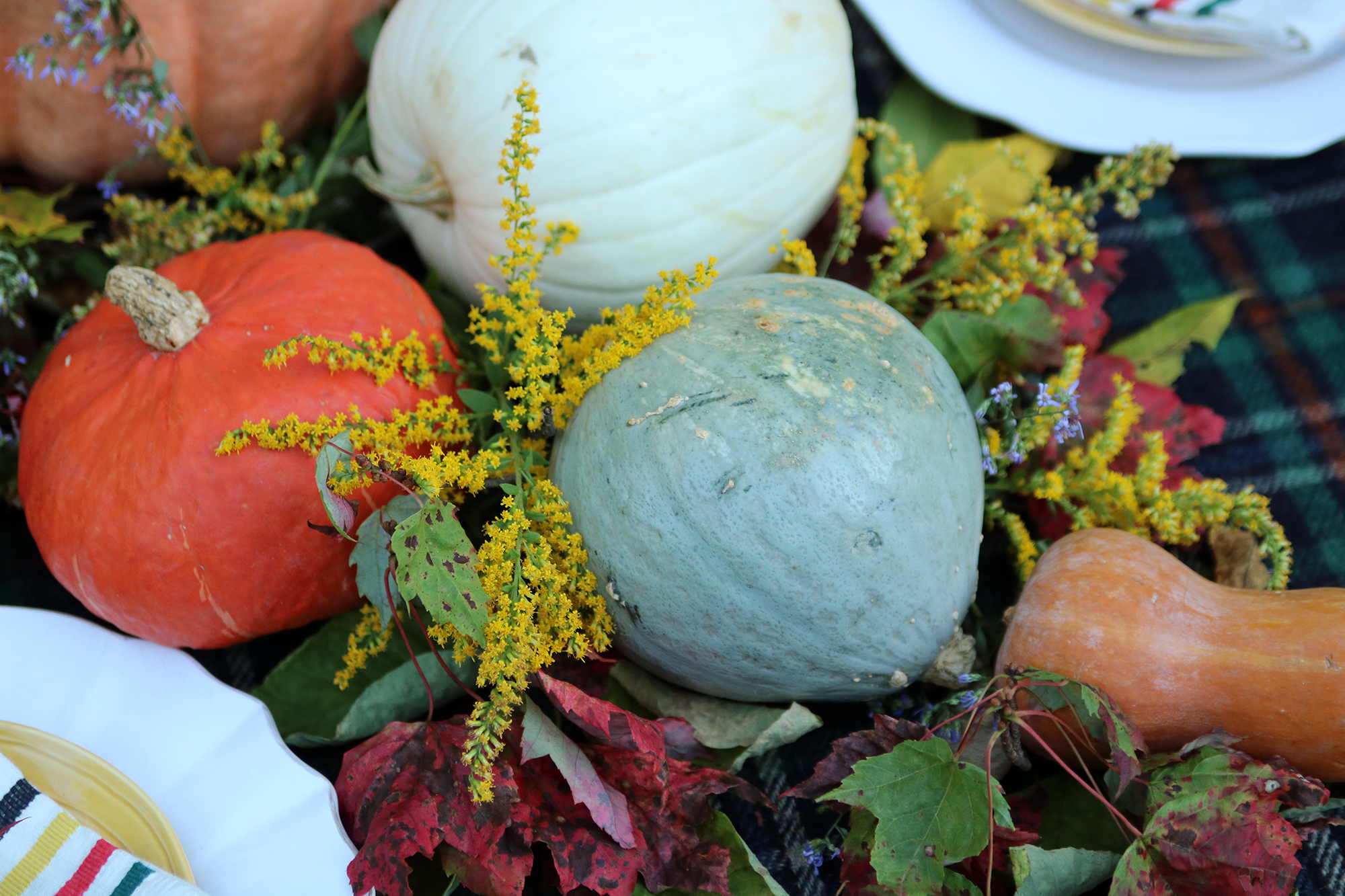 Step 4 – Add some greenery. Stroll around your property for some fallen branches or prune an overgrown tree with colorful fall foliage. Snip some wildflowers — we got these from the side of a road. Start to place the branches around your pumpkins (inside and out) throughout the table. Now place your flowers the same way. The more imperfect it looks, the more perfect it is!