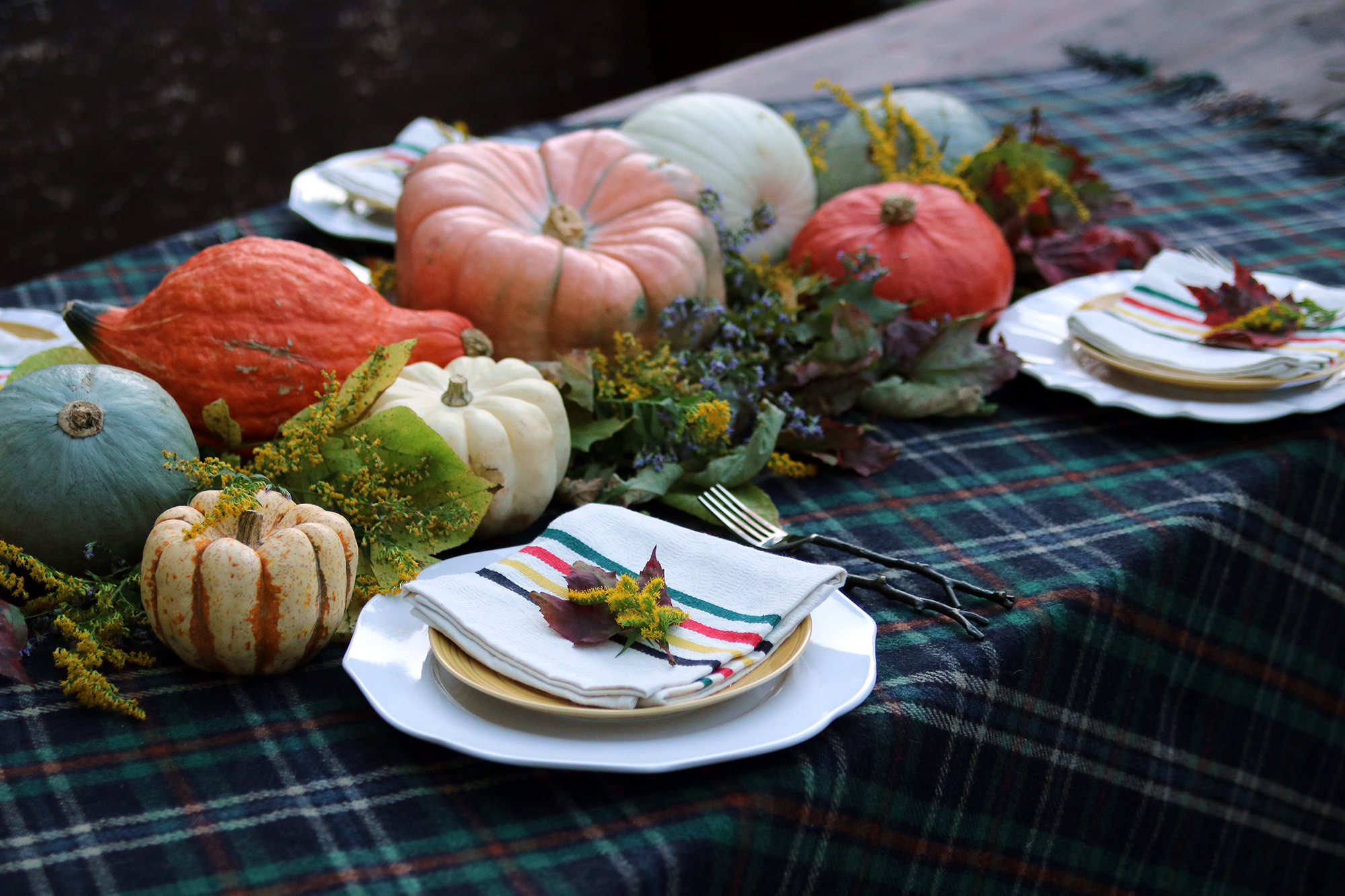 Step 5 – Lastly, it’s time to set the table! We usually use our ironstone dinner plates as a base then mix and match the salad plates or pop some color like we did here with these mustard wood grain plates (from Home Goods). I’m a sucker for cloth napkins! Tie in the colors from your table to your napkins and don’t be afraid to mix patterns. We got these colorful National Park linen napkins from Pendleton. Place your flatware accordingly. Finally, we always like to garnish each seat with something leftover from our foraging trip.