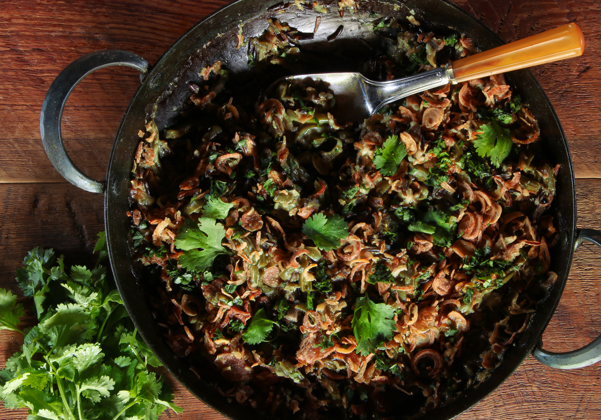 This is our take on the favorite Thanksgiving casserole. In place of green beans we use nopalitos, a traditional Mexican preparation of tender cactus, onion, cilantro, and hot peppers (typically jalapeños or serranos). We also boost the original mushroom flavor by replacing soy sauce with Chinese mushroom sauce and adding a generous measure of luxurious porcini mushrooms. Wild rice lends a complex nuttiness to the dish, along with a chewy texture.