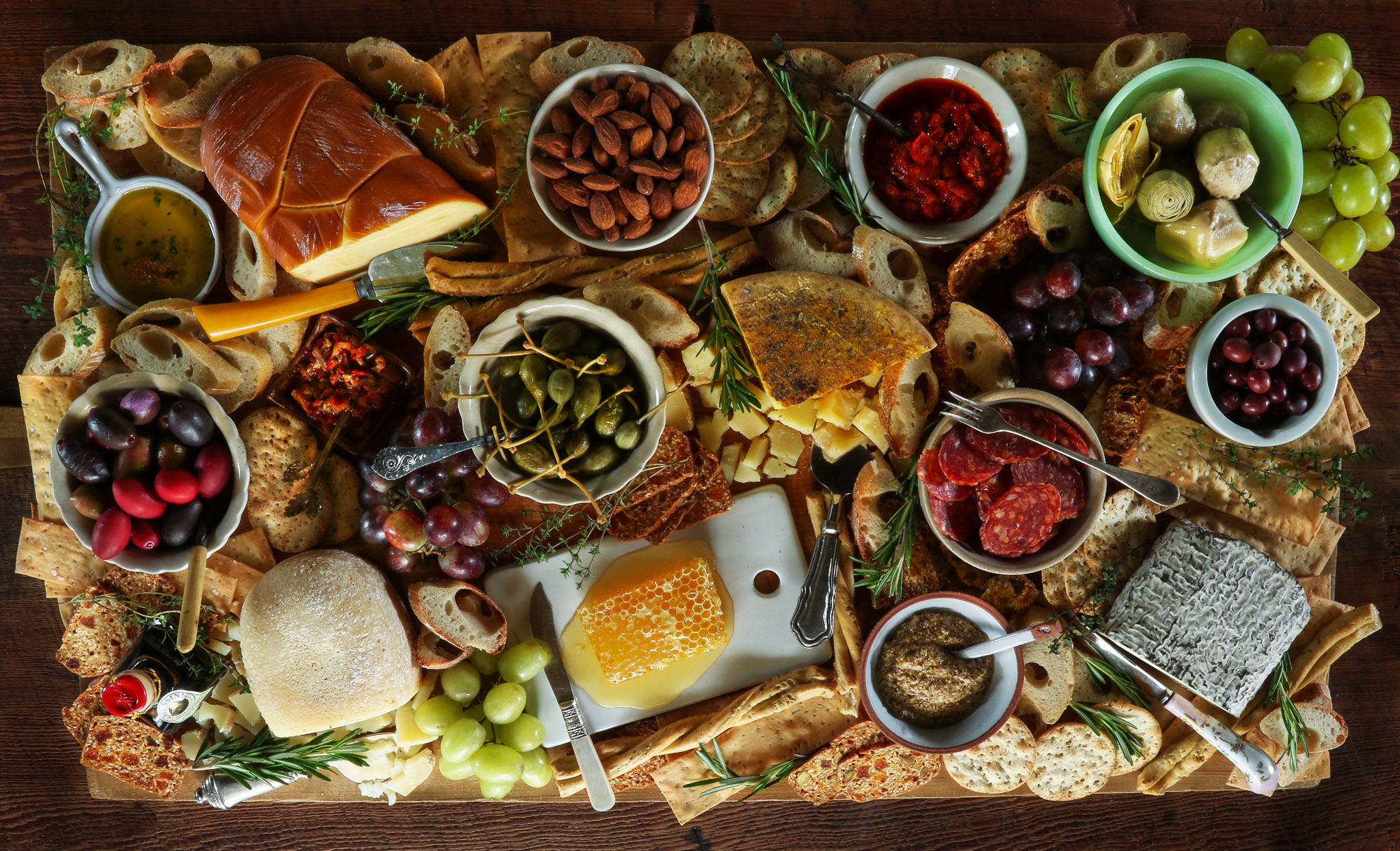 - After you’ve layered in everything add some garnish to your board to wow your guests. We love using herbs like rosemary, thyme, or sage. This is great because the herbs can always be used for cooking the next day. Depending on seasonal availability, try edible flowers or fresh fruit, too.