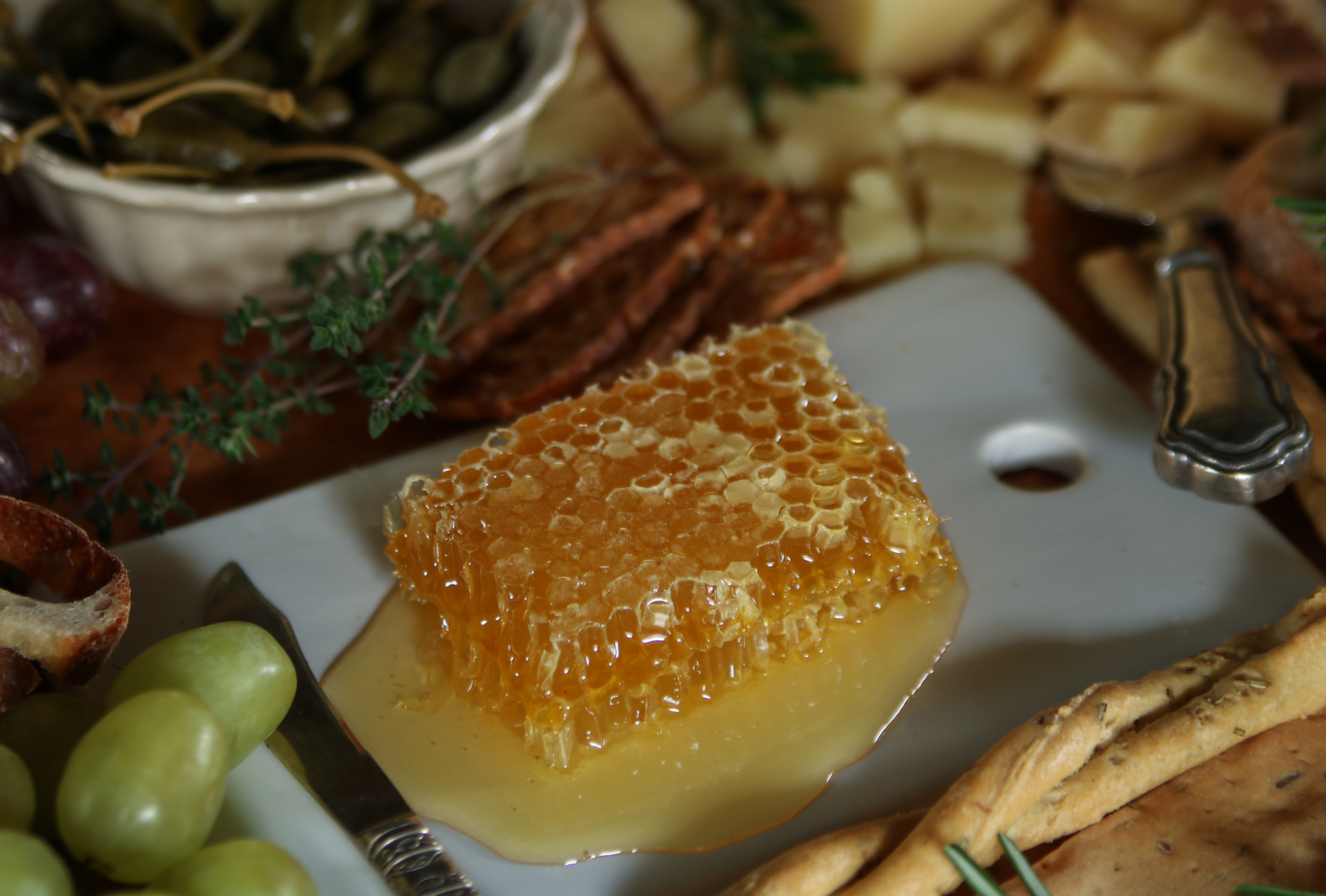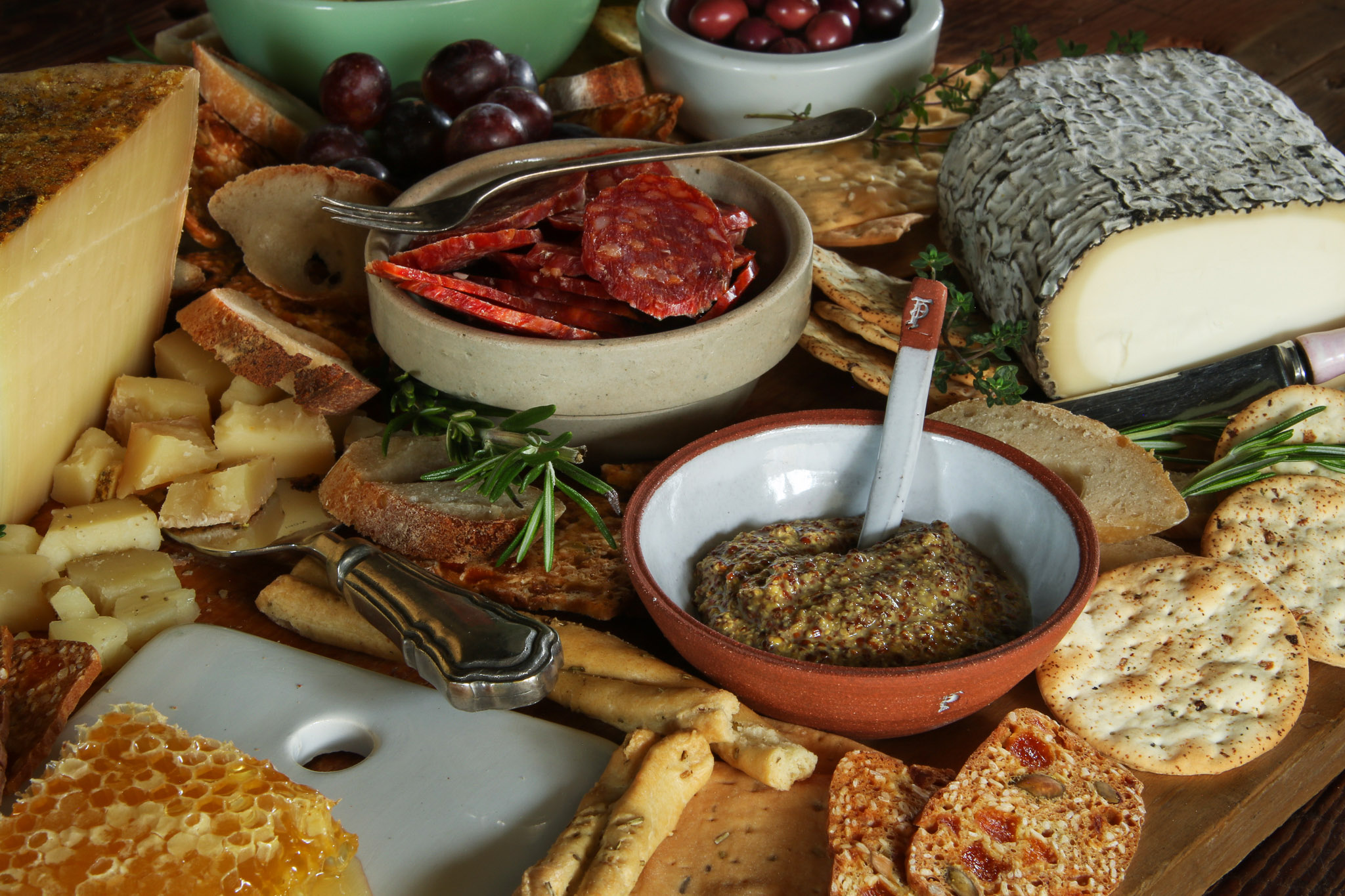 - A great cheeseboard will also have some additional nibbles that compliment or even enhance your cheeses. Add something brined or cured (olives always work nicely or try giant capers for a change) and something pickled, along with a unique mustard. Use preserves, honey, or dried fruits like figs to add something sweet—and colorful—in addition to a variety of nuts for a salty crunch. Additionally, you can add cured meats such as prosciutto, salami or pepperoni.
